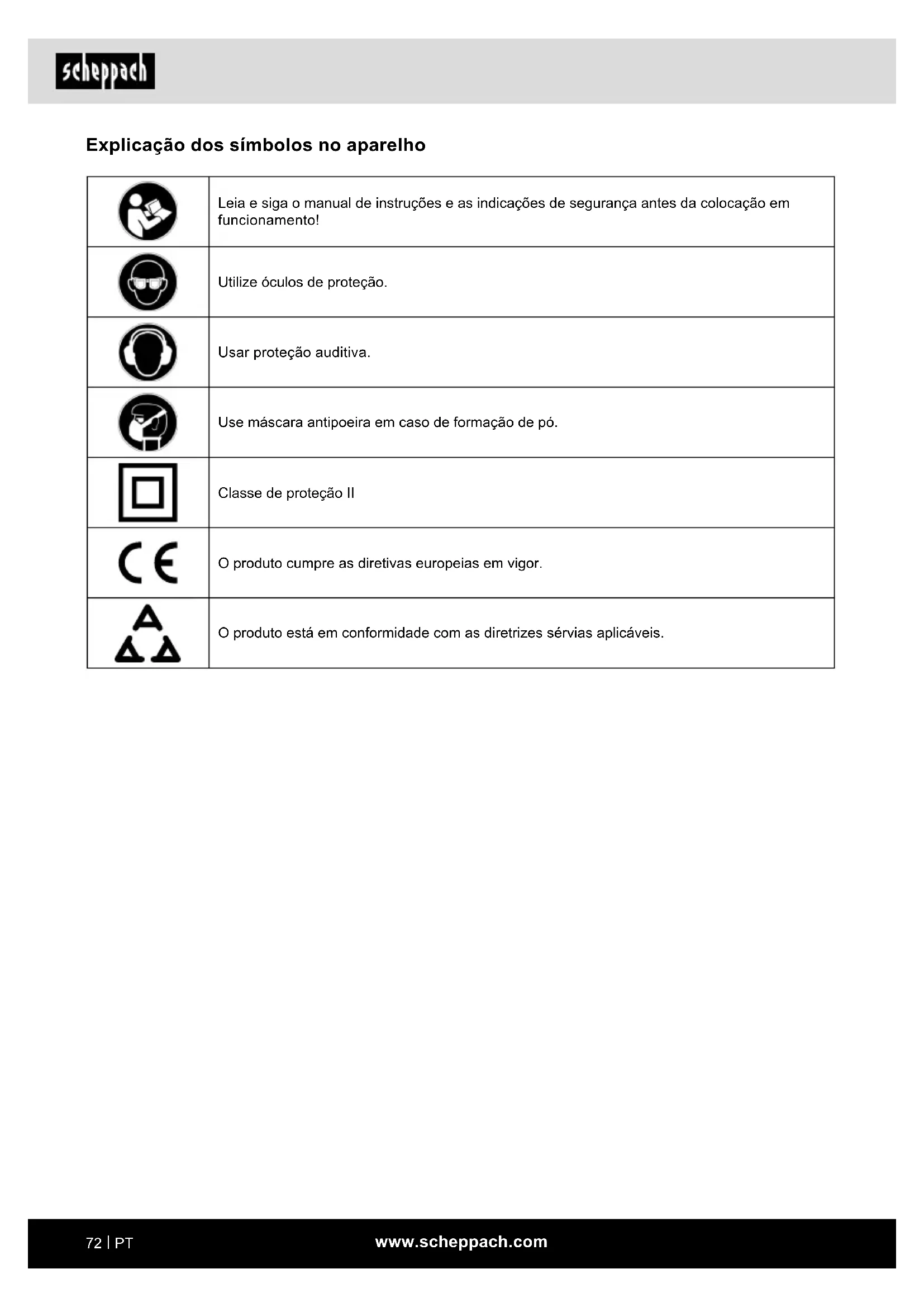 Explicação dos símbolos no aparelho Leia e siga o manual de instruções e as indicações de segurança antes da colocação em funcionamento! Utilize óculos de proteção. Usar proteção auditiva. Use máscara antipoeira em caso de formação de pó. Classe de proteção II O produto cumpre as diretivas europeias em vigor. O produto está em conformidade com as diretrizes sérvias aplicáveis.www.scheppach.com