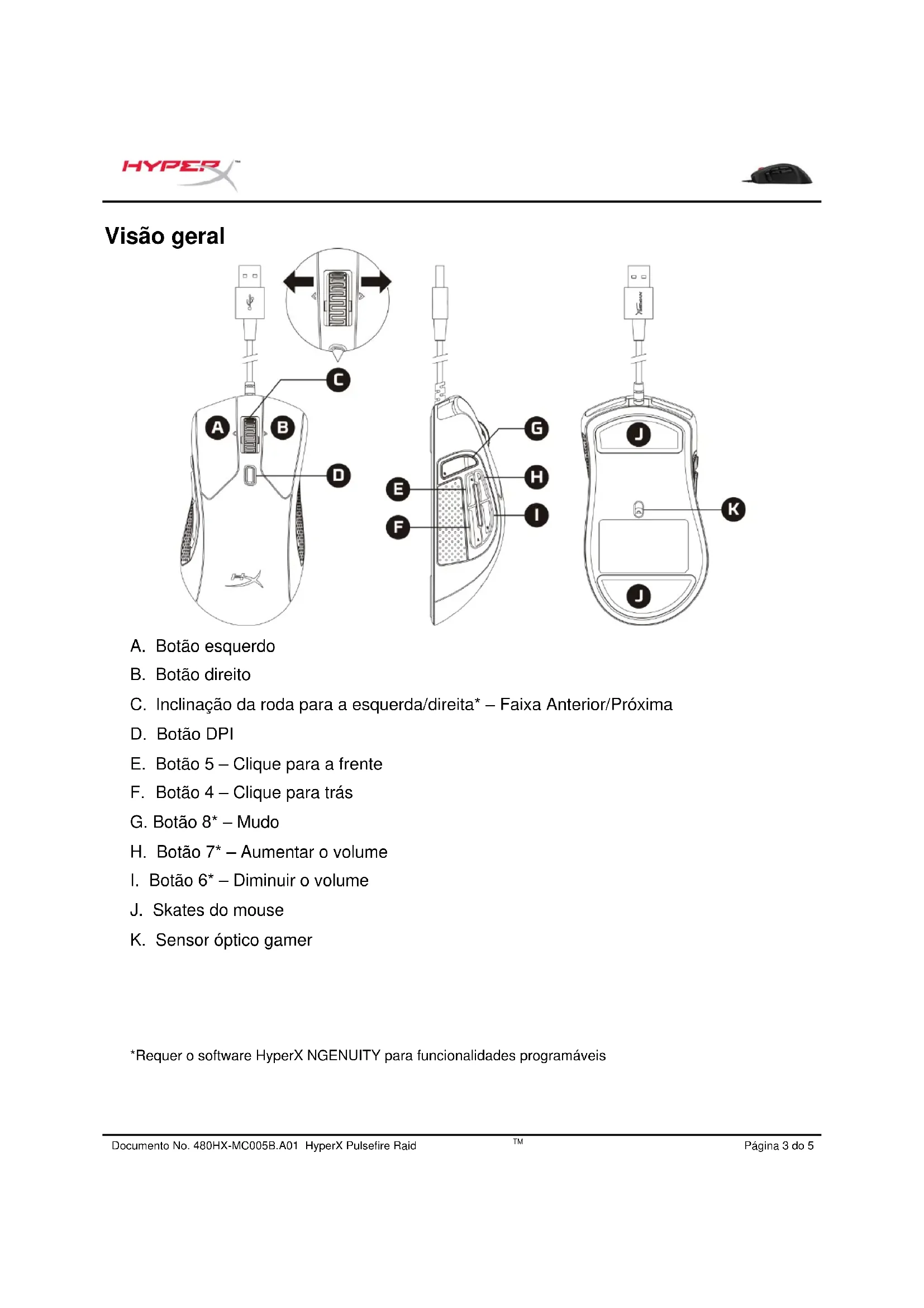 Consulte nossa Página de Suporte para mais informações relativas ao peso. Documento No. 480HX-MC005B.A01 HyperX Pulsefire Raid Página 4 do 5Instalação Conecte o conector USB ao computador. Teclas de função Teclas de função Recurso secundário Botão DPI Alterne entre DPIs predefinidos. Os valores padrão são: - 800 DPI (azul). - 1600 DPI (amarelo). - 3200 DPI (verde). Software HyperX NGENUITY Para personalizar as configurações de iluminação, DPI e macro, faça o download do software HyperX NGENUITY aqui: hyperxgaming.com/ngenuity. Usando com Console Conecte o conector USB ao PS4 ou Xbox One para usar com o console. Redefinir para as configurações de fábrica Se estiver enfrentando algum problema com o mouse, você pode retornar às configurações de fábrica. A memória integrada será apagada e todas as configurações voltarão ao padrão de fábrica. Teclas de função Recurso secundário