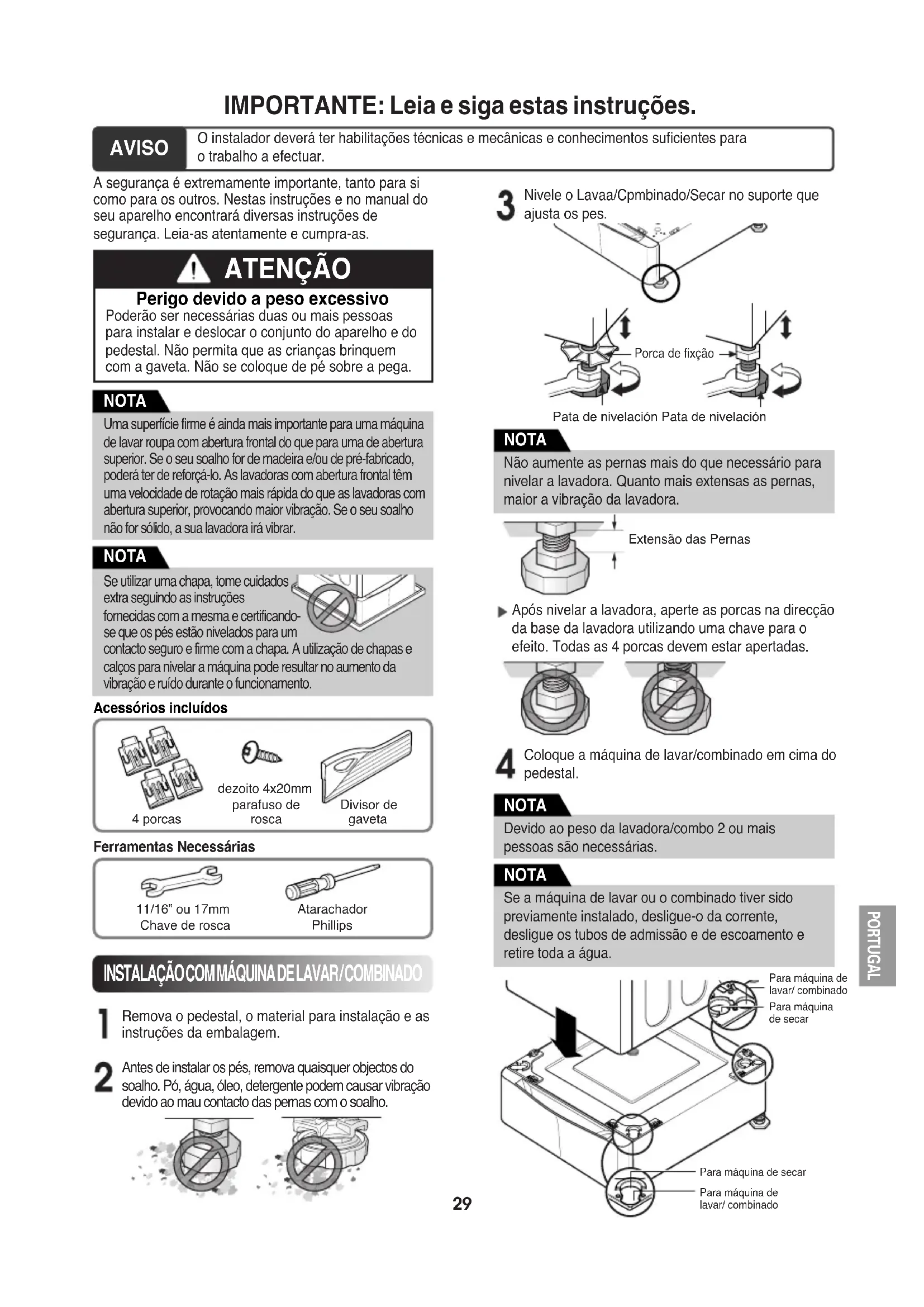 ventilationsklemmen kan løsnes. Ventilationsklemmen løsnes, hvorefter udtræksventilen forsigtigt fjernes fra udtaget. Låsem- øtrik Justerbar fod Justerbar fod Justerbar fod Anbring den tørretumbler det ønskede sted. Efter samling skal apparatet og soklen anbringes på et stabilt og plant gulv for at kunne fungere korrekt. Reguler apparatets fødder og sokkel ved hjælp af en skruenøgle. Juster derefter låsemøtrikken i retning af soklen, mens soklens fod fastholdes ved hjælp af skruenøgle. Skal installeres af montør med relevant erfaring og uddannelsesmæssig baggrund. BEMÆRK Hvis skruerne ikke er sat korrekt i, kan det resultere i støj og vibrationer. BEMÆRK T-clips Holder Vaskemaskine / Kombineret tørretumbler DANISH29 Para máquina delavar/ combinadoPara máquinade secarPara máquina de secarPara máquina delavar/ combinadoPorca de fixçãoPata de nivelación Pata de nivelaciónExtensão das Pernas IMPORTANTE: Leia e siga estas instruções. AVISO O instalador deverá ter habilitações técnicas e mecânicas e conhecimentos suficientes parao trabalho a efectuar. A segurança é extremamente importante, tanto para sicomo para os outros. Nestas instruções e no manual doseu aparelho encontrará diversas instruções desegurança. Leia-as atentamente e cumpra-as.Remova o pedestal, o material para instalação e asinstruções da embalagem.Coloque a máquina de lavar/combinado em cima dopedestal. ATENÇÃO Perigo devido a peso excessivo Poderão ser necessárias duas ou mais pessoaspara instalar e deslocar o conjunto do aparelho e dopedestal. Não permita que as crianças brinquemcom a gaveta. Não se coloque de pé sobre a pega.Antes de instalar os pés, remova quaisquer objectos dosoalho. Pó, água, óleo, detergente podem causar vibraçãodevido ao mau contacto das pernas com o soalho.Após nivelar a lavadora, aperte as porcas na direcçãoda base da lavadora utilizando uma chave para oefeito. Todas as 4 porcas devem estar apertadas.Nivele o Lavaa/Cpmbinado/Secar no suporte queajusta os pes. NOTA Se utilizar uma chapa, tome cuidadosextra seguindo as instruçõesfornecidas com a mesma e certificando-se que os pés estão nivelados para umcontacto seguro e firme com a chapa. A utilização de chapas ecalços para nivelar a máquina pode resultar no aumento davibração e ruído durante o funcionamento. NOTA Não aumente as pernas mais do que necessário paranivelar a lavadora. Quanto mais extensas as pernas,maior a vibração da lavadora. NOTA Devido ao peso da lavadora/combo 2 ou maispessoas são necessárias. NOTA Se a máquina de lavar ou o combinado tiver sidopreviamente instalado, desligue-o da corrente,desligue os tubos de admissão e de escoamento eretire toda a água. NOTA Uma superfície firme é ainda mais importante para uma máquinade lavar roupa com abertura frontal do que para uma de aberturasuperior. Se o seu soalho for de madeira e/ou de pré-fabricado,poderá ter de reforçá-lo. As lavadoras com abertura frontal têmuma velocidade de rotação mais rápida do que as lavadoras comabertura superior, provocando maior vibração. Se o seu soalhonão for sólido, a sua lavadora irá vibrar.PORTUGAL INSTALAÇÃO COM MÁQUINA DE LAVAR / COMBINADO Acessórios incluídos4 porcasdezoito 4x20mmparafuso deroscaDivisor degavetaFerramentas Necessárias11/16” ou 17mmChave de roscaAtarachadorPhillips30 Certifique-se de que os orifícios nos pés estão alinhados com os orifícios no aparelho e instale os 4 parafusos em cada canto apertando-os firmemente. Nivele o Lavaa/Cpmbinado no suporte que ajusta os pés. Porca de fixção Pata de nivelación Pata de nivelación Coloque a máquina de lavar/combinado no local pretendido. Verificação Diagonal Quando desce as pontas da máquina de lavar roupa para a chapa na diagonal, a máquina não deve ser mover-se nem para cima nem para baixo! (Verifique as instruções) Se a máquina abanar quando puxar a placa superior da mesma, ajuste novamente os pés. NOTA Para se certificar de que a lavadora está devidamente nivelada, ligue-a com uma carga de teste: coloque aprox. 2,7KG de roupa na lavadora. Pressione POWER, pressione RINSE+SPIN, e pressione o botão START/PAUSE. Consulte as seguintes secções para informação adicional acerca da selecção do ciclo de lavagem. Certifique-se de que a lavadora não vibra ou abana excessivamente durante o ciclo de torção. Se a lavador vibrar ou abanar, ajuste o nível dos pés até estabilizar. NOTA A má instalação dos parafusos pode resultar em vibração e ruído. Para Máquina de Lavar: 16 parafusos Para Máquina de Secar: 8 parafusos NOTA O conjunto do aparelho e do pedestal deve ser colocado num piso sólido e direito, para que o aparelho funcione correctamente. Ajuste os pés do aparelho e do pedestal, rodando-os com a ajuda de uma chave de parafusos. Em seguida, ajuste a porca de fixação ao pedestal, segurando o pé do mesmo com uma chave de parafusos. O instalador deverá ter habilitações técnicas e mecânicas e conhecimentos suficientes para o trabalho a efectuar. NOTA Porca de fixção Pata de nivelación Pata de nivelación PORTUGAL31 Devido ao peso da máquina de secar, poderão ser necessárias duas ou mais pessoas. NOTA Remove pedestal,installation hardware, and instructions from the shipping carton. Certifique-se de que os orifícios nos pés estão alinhados com os orifícios no aparelho e instale os 2 parafusos em cada canto apertando-os firmemente.
