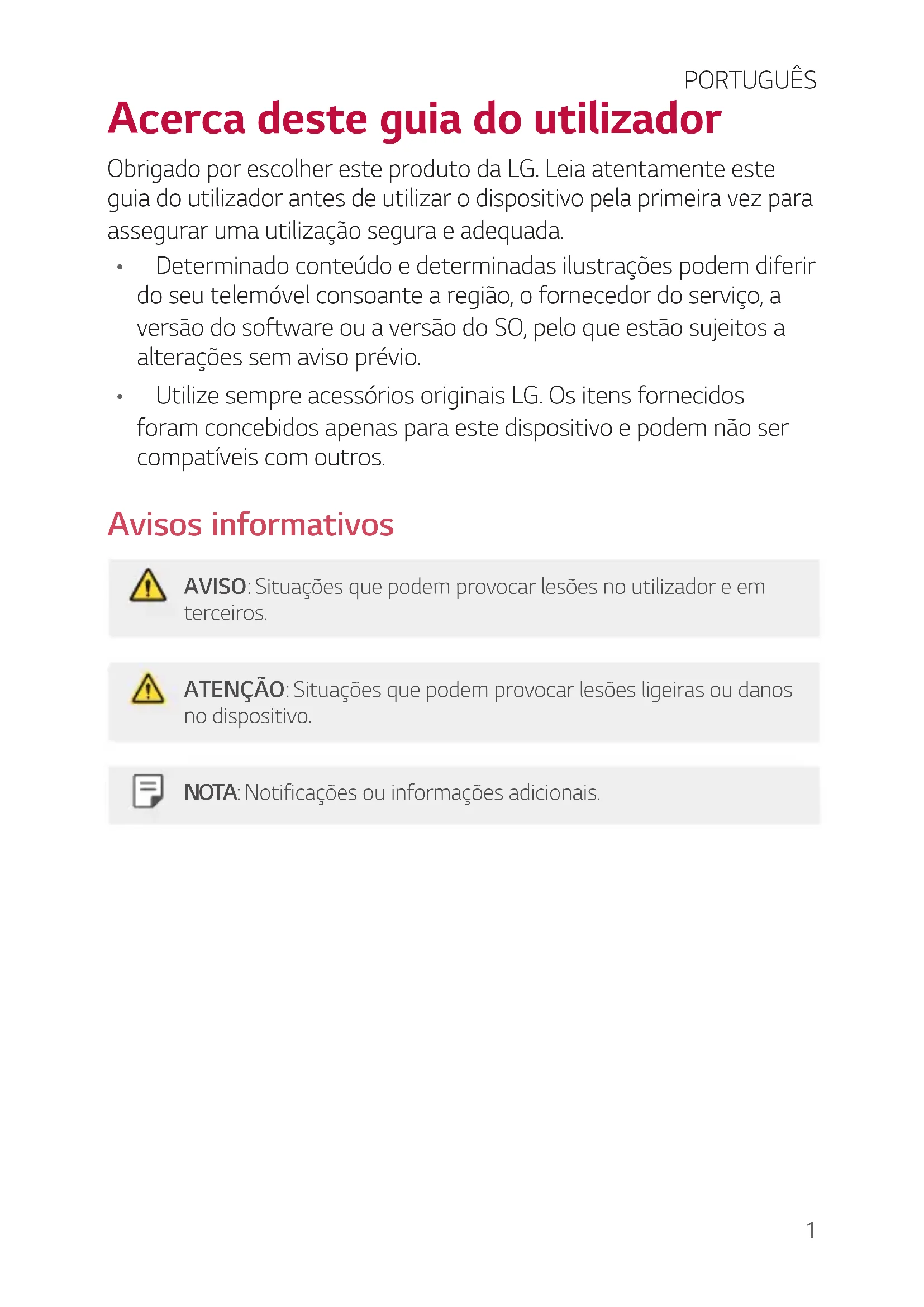 - Utilize sempre acessórios originais LG. Os itens fornecidos foram concebidos apenas para este dispositivo e podem não ser compatíveis com outros. Avisos informativos AVISO: Situações que podem provocar lesões no utilizador e em terceiros. ATENÇÃO: Situações que podem provocar lesões ligeiras ou danos no dispositivo. NOTA: Notificações ou informações adicionais. PORTUGUÊS2