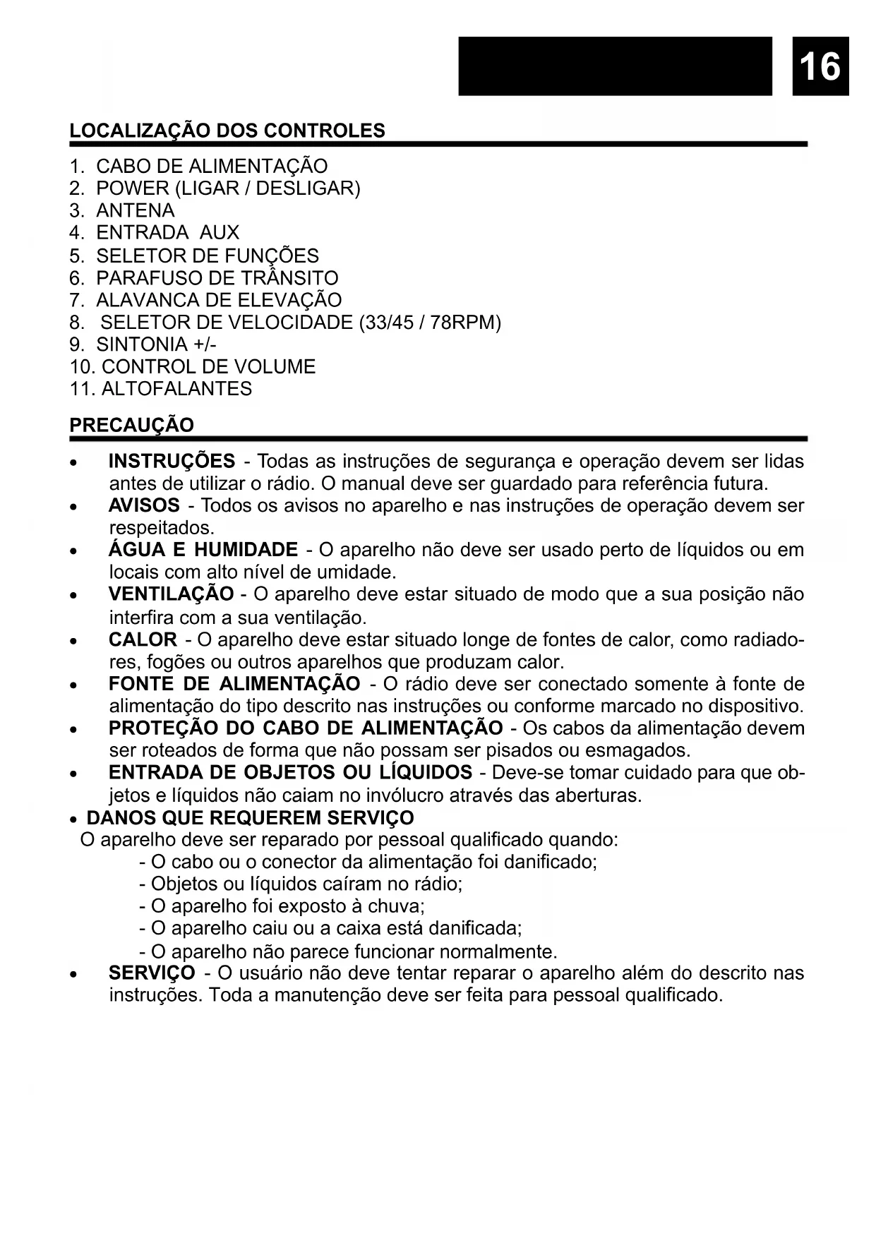 PRECAUÇÃO INSTRUÇÕES - Todas as instruções de segurança e operação devem ser lidas antes de utilizar o rádio. O manual deve ser guardado para referência futura. AVISOS - Todos os avisos no aparelho e nas instruções de operação devem ser respeitados. ÁGUA E HUMIDADE - O aparelho não deve ser usado perto de líquidos ou em locais com alto nível de umidade. VENTILAÇÃO - O aparelho deve estar situado de modo que a sua posição não interfira com a sua ventilação. CALOR - O aparelho deve estar situado longe de fontes de calor, como radiado- res, fogões ou outros aparelhos que produzam calor. FONTE DE ALIMENTAÇÃO - O rádio deve ser conectado somente à fonte de alimentação do tipo descrito nas instruções ou conforme marcado no dispositivo. PROTEÇÃO DO CABO DE ALIMENTAÇÃO - Os cabos da alimentação devem ser roteados de forma que não possam ser pisados ou esmagados. ENTRADA DE OBJETOS OU LÍQUIDOS - Deve-se tomar cuidado para que ob- jetos e líquidos não caiam no invólucro através das aberturas.