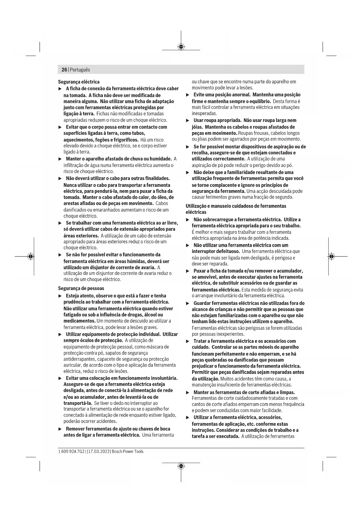 e durante o armazenamento °C −15…+50 Baterias recomendadas GBA 18V.… ProCORE18V… Carregadores recomendados GAL 18… GAX 18… GAL 36… A) Dependendo da bateria utilizada B) Potência limitada com temperaturas <0 °C Informação sobre ruídos/vibrações Os valores de emissão de ruído foram determinados de acordo comEN62841-1. O nível de pressão sonora avaliado como A da ferramenta elétrica é inferior a 70dB(A). O nível sonoro durante os trabalhos pode ultrapassar os valores indicados. Utilizar proteção auditiva! Valores totais de vibração a