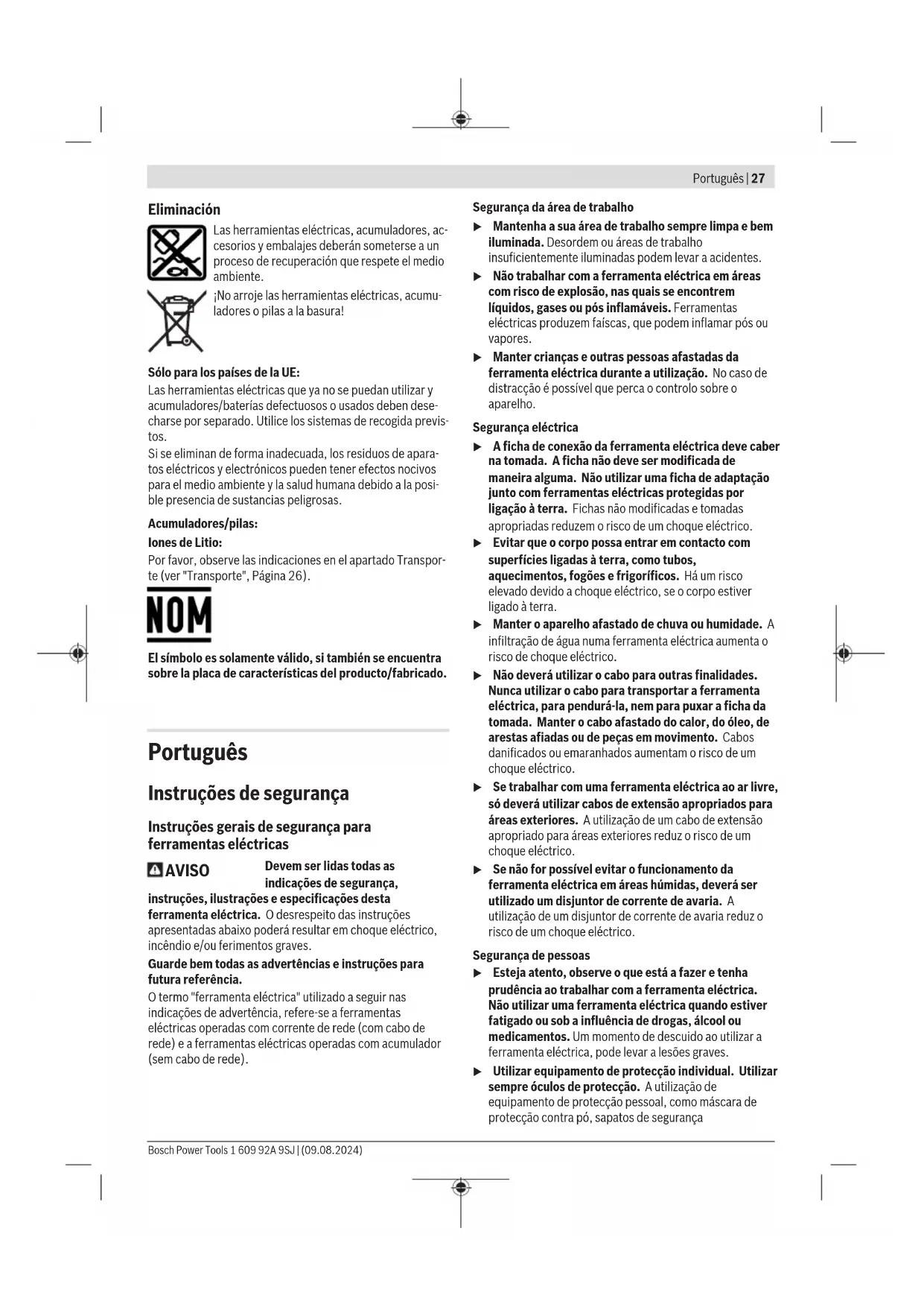 As ferramentas elétricas que ja não são úteis e as pilhas/ baterias com defeito ou usadas tem de ser eliminadas separadamente. Utilize os sistemas de recolha previstos para oefeito.