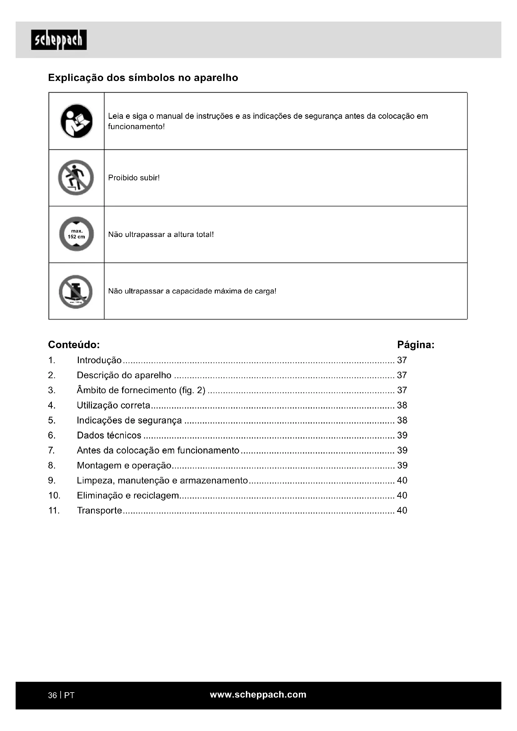 Explicação dos símbolos no aparelho Leia e siga o manual de instruções e as indicações de segurança antes da colocação em funcionamento! Proibido subir! max. 152 cm Não ultrapassar a altura total! Não ultrapassar a capacidade máxima de carga! Conteúdo: Página: 1. Introdução .......................................................................................................... 37