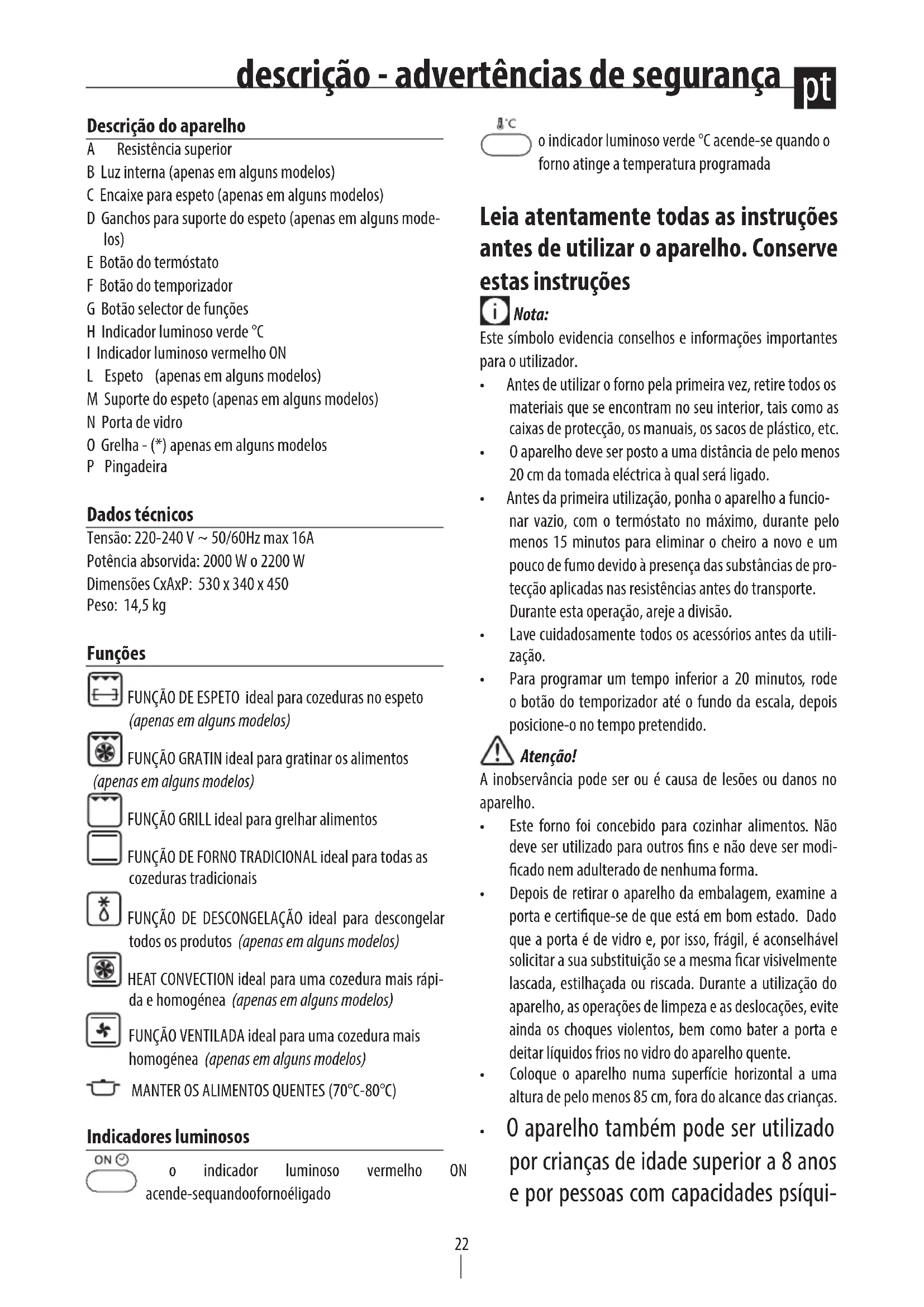 Descrição do aparelho A Resistênciasuperior B Luz interna (apenas em alguns modelos) C Encaixe para espeto (apenas em alguns modelos) D Ganchos para suporte do espeto (apenas em alguns mode- los) E Botão do termóstato F Botão do temporizador G Botão selector de funções H Indicador luminoso verde °C I Indicador luminoso vermelho ON L Espeto (apenas em alguns modelos) M Suporte do espeto (apenas em alguns modelos) N Porta de vidro O Grelha - (*) apenas em alguns modelos P Pingadeira Dados técnicos Tensão: 220-240 V ~ 50/60Hz max 16A Potênciaabsorvida:2000Wo2200W Dimensões CxAxP: 530 x 340 x 450 Peso: 14,5 kg Funções FUNÇÃO DE ESPETO ideal para cozeduras no espeto (apenas em alguns modelos) FUNÇÃO GRATIN ideal para gratinar os alimentos (apenas em alguns modelos) FUNÇÃO GRILL ideal para grelhar alimentos FUNÇÃO DE FORNO TRADICIONAL ideal para todas as cozeduras tradicionais FUNÇÃO DE DESCONGELAÇÃO ideal para descongelar todos os produtos (apenas em alguns modelos) HEAT CONVECTION ideal para uma cozedura mais rápi- da e homogénea (apenas em alguns modelos) FUNÇÃO VENTILADA ideal para uma cozedura mais homogénea (apenas em alguns modelos) MANTER OS ALIMENTOS QUENTES (70°C-80°C) Indicadores luminosos o indicador luminoso vermelho ON acende-se quando o forno é ligado o indicador luminoso verde °C acende-se quando o forno atinge a temperatura programada Leia atentamente todas as instruções antes de utilizar o aparelho. Conserve estas instruções Nota: Este símbolo evidencia conselhos e informações importantes para o utilizador.
