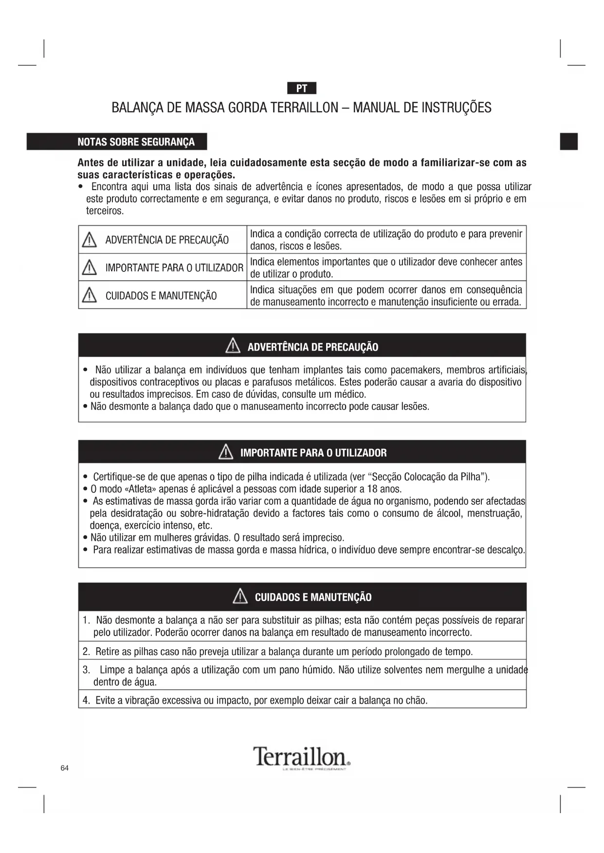 - Para realizar estimativas de massa gorda e massa hídrica, o indivíduo deve sempre encontrar-se descalço. BALANÇA DE MASSA GORDA TERRAILLON – MANUAL DE INSTRUÇÕES Antes de utilizar a unidade, leia cuidadosamente esta secção de modo a familiarizar-se com as suas características e operações.