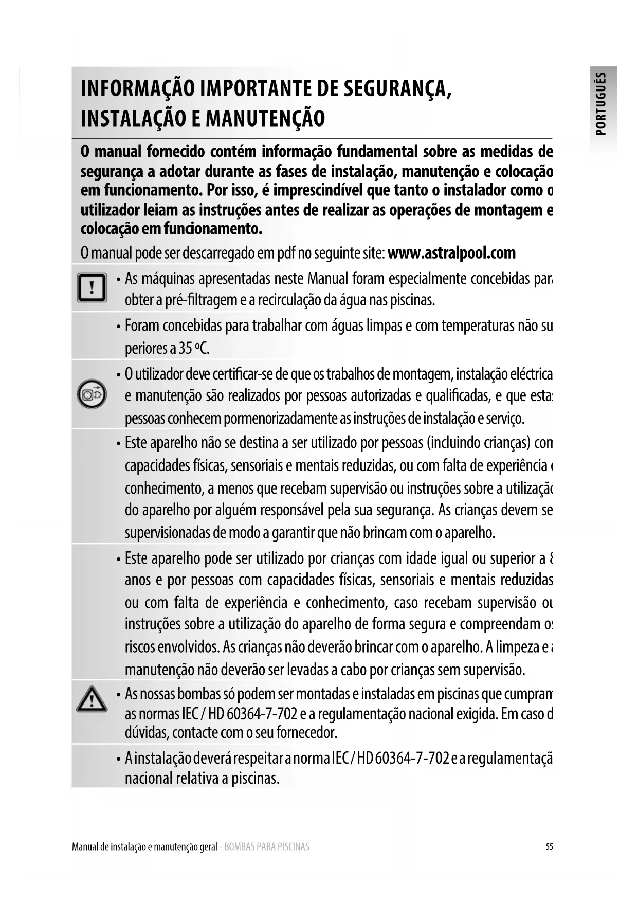 O manual fornecido contém informação fundamental sobre as medidas de segurança a adotar durante as fases de instalação, manutenção e colocação em funcionamento. Por isso, é imprescindível que tanto o instalador como o utilizador leiam as instruções antes de realizar as operações de montagem e colocação em funcionamento. O manual pode ser descarregado em pdf no seguinte site: www.astralpool.com