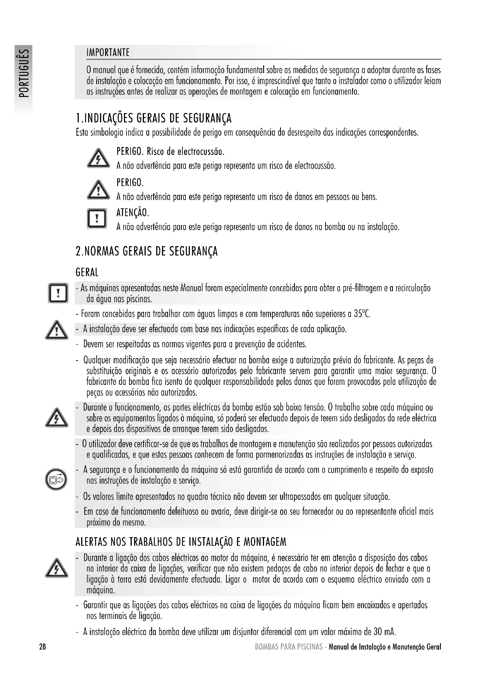 GERAL - As máquinas apresentadas neste Manual foram especialmente concebidas para obter a pré-filtragem e a recirculação da água nas piscinas. - Foram concebidas para trabalhar com águas limpas e com temperaturas não superiores a 35ºC. - A instalação deve ser efectuada com base nas indicações específicas de cada aplicação. - Devem ser respeitadas as normas vigentes para a prevenção de acidentes. - Qualquer modificação que seja necessário efectuar na bomba exige a autorização prévia do fabricante. As peças de substituição originais e os acessório autorizados pelo fabricante servem para garantir uma maior segurança. O fabricante da bomba fica isento de qualquer responsabilidade pelos danos que forem provocados pela utilização de peças ou acessórios não autorizados. - Durante o funcionamento, as partes eléctricas da bomba estão sob baixa tensão. O trabalho sobre cada máquina ou sobre os equipamentos ligados à máquina, só poderá ser efectuado depois de terem sido desligados da rede eléctrica e depois dos dispositivos de arranque terem sido desligados. - O utilizador deve certificar-se de que os trabalhos de montagem e manutenção são realizados por pessoas autorizadas e qualificadas, e que estas pessoas conhecem de forma pormenorizadas as instruções de instalação e serviço. - A segurança e o funcionamento da máquina só está garantida de acordo com o cumprimento e respeito do exposto nas instruções de instalação e serviço. - Os valores limite apresentados no quadro técnico não devem ser ultrapassados em qualquer situação. - Em caso de funcionamento defeituoso ou avaria, deve dirigir-se ao seu fornecedor ou ao representante oficial mais próximo do mesmo. ALERTAS NOS TRABALHOS DE INSTALAÇÃO E MONTAGEM - Durante a ligação dos cabos eléctricos ao motor da máquina, é necessário ter em atenção a disposição dos cabos no interior da caixa de ligações, verificar que não existem pedaços de cabo no interior depois de fechar e que a ligação à terra está devidamente efectuada. Ligar o motor de acordo com o esquema eléctrico enviado com a máquina. - Garantir que as ligações dos cabos eléctricos na caixa de ligações da máquina ficam bem encaixados e apertados nos terminais de ligação. - A instalação eléctrica da bomba deve utilizar um disjuntor diferencial com um valor máximo de 30 mA.PORTUGUÊS Manual de Instalação e Manutenção Geral - BOMBAS PARA PISCINAS 29 - Comprovar que se utiliza correctamente a junta da caixa de terminais, evitando assim a entrada de água na caixa de terminais do motor eléctrico, e que foi colocada e apertada a junta de vedação no interior do passa-cabos da caixa de terminais. - É necessário ter atenção para que, de forma alguma, entre água no motor e nas partes eléctricas em tensão. - Caso a utilização prevista não seja a indicada, poderá ser necessário implementar medidas e normas técnicas suplementares.