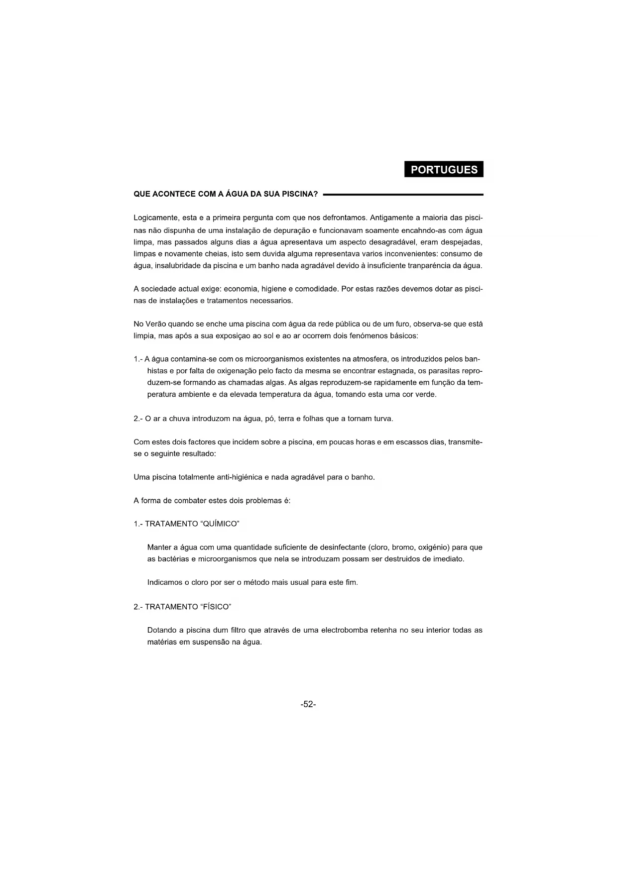 Dotando a piscina dum filtro que através de uma electrobomba retenha no seu interior todas as matérias em suspensão na água. PORTUGUES -52-O pH O pH é o grau de acidez da água. Os valores do pH estão compreendidos entre 0 e 14, correspon- dendo o valor 7 ao grau neutro. Os valores entre 0 e 7 são os graus ácidos e entre 7 e 14 aos alcali- nos, embora os valores mais usuais numa piscina são os compreendidos entre 6,8 e 8,4. Porque é importante o pH? “O VALOR IDEAL DO PH NUMA PISCINA DEVE SITUAR-SE ENTRE 7,2 E 7,6”. Anteriormente indicámos, que para a destruição de bactérias, deveriamos manter a água com uma quantidade de cloro residual suficiente para o efeito, porém esto cloro só actua eficazmente como bac- téricida, quando a água onde se dilue tenha um pH comprendido entre 7,2 e 7,6. Assim, verifica-se que para destruir as bactérias é fundamental manter o pH nos valores indicados. Existem outros factores que obrigam a manter o pH correcto, sendo superior a 7,6 o ácido dissolvido na água precipitar-se-á de forma visivél turvando a água, dando-lhe um aspecto leitoso, obstruindo rapidamente o filtro e precipitando-se nas paredes e acessórios da piscina. Sendo inferior a 7,2 a água sera corrosiva, produzindo irritações nos olhos e nas mucosas nasais, podendo chegar a destruir partes metlicas da instalação de filtração. Pelo exposto conclui-se que a grande qualidade da água da piscina, depende bastante do valor do pH. O CLORO Normas legais As disposições sanitáris portuguesas vigentes determinam que a quantidade de cloro livre na água das piscinas deve estar compreendido entre 0,20 a 0,60 mg por litro (0,2 a 0,6 p.p.m.). O que entenden por: cloro livre residual Na água mesmo depois de infiltrada existem una série de inimigos invisiveis que é preciso destruir. Para os destruirmos é necessário uma quantidade determinada de cloro que actue sob a forma de ácido hipoclorosos. A quantidade de cloro adicina-se acima da necessária para destruir bactérias e oxidar a materia organ- ica que fica livre na água sob a forma de ácido hipocloroso á espera de actuar contra qualquier inimi- go: bactérias, matéria orgánica, etc. , que se introduzam novamente na água através dos banhistas, agentes atmosféricos (chuva, vento, etc), ou por qualquer outro meio. -53-O cloro que fica sob a forma de ácido hipocloroso á espera de actuar e que sobrou da necessidade imediata denomina-se cloro livre ou residual.