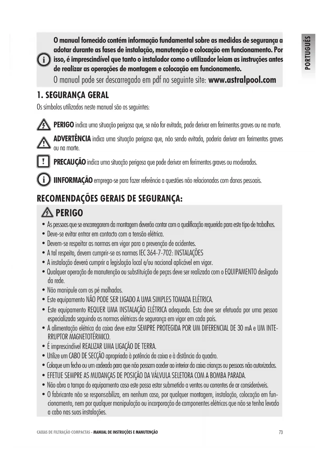Os símbolos utilizados neste manual são os seguintes: PERIGO indica uma situação perigosa que, se não for evitada, pode derivar em ferimentos graves ou na morte. ADVERTÊNCIA indica uma situação perigosa que, não sendo evitada, poderia derivar em ferimentos graves ou na morte. PRECAUÇÃO indica uma situação perigosa que pode derivar em ferimentos graves ou moderados. IINFORMAÇÃO emprega-se para fazer referência a questões não relacionadas com danos pessoais. O manual fornecido contém informação fundamental sobre as medidas de segurança a adotar durante as fases de instalação, manutenção e colocação em funcionamento. Por isso, é imprescindível que tanto o instalador como o utilizador leiam as instruções antes de realizar as operações de montagem e colocação em funcionamento. O manual pode ser descarregado em pdf no seguinte site: www.astralpool.com PERIGO