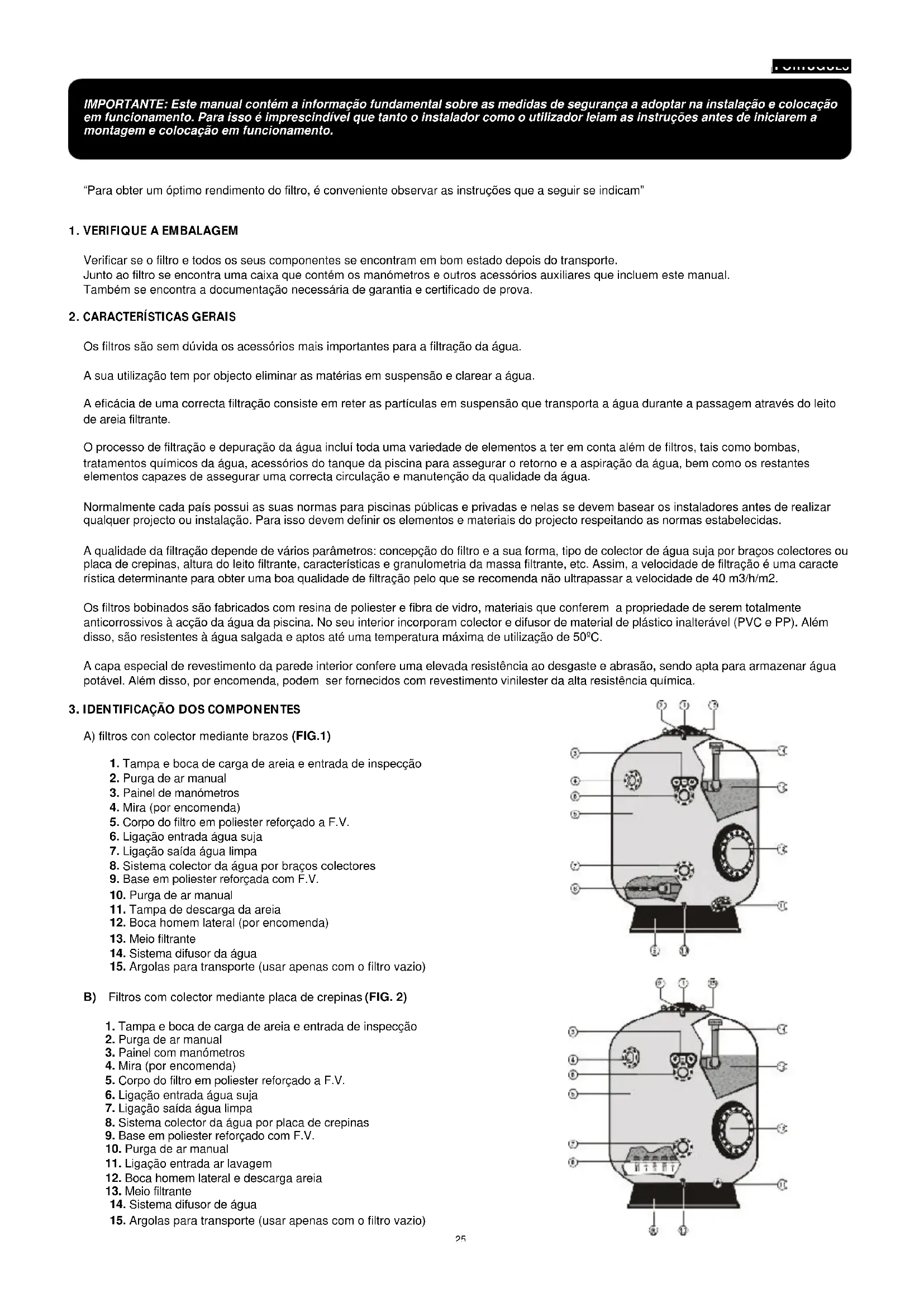 PISCINAPARA APISCINA FIG.11 FIG.12 FIG.13 2911. MANUTENÇÃO Uma limpeza regular e a fundo é necessária para a manutenção da sua piscina, isto permitirá uma redução de trabalho, uma maior durabilidade do equipamento e uma melhor qualidade da água. Realize uma correcta manutenção do equipamento de filtração (bombas, válvulas, etc...) seguindo as recomendações do fabricante. Verifique periodicamente o meio filtrante e todos os componentes do filtro (difusores, braços colectores, purgas de água e ar, tubagem, juntas, etc...) incluindo o corpo de poliester substituindo ou reparando as partes danificadas. Limpe o filtro com água a pressão periodicamente para retirar o pó acumulado com o passar do tempo. Não utilize dissolventes que possam danificar as partes plásticas ou o difusor. Se fechar a sua piscina durante o inverno, vaze adequadamente todo o equipamento para evitar que o gelo o danifique.