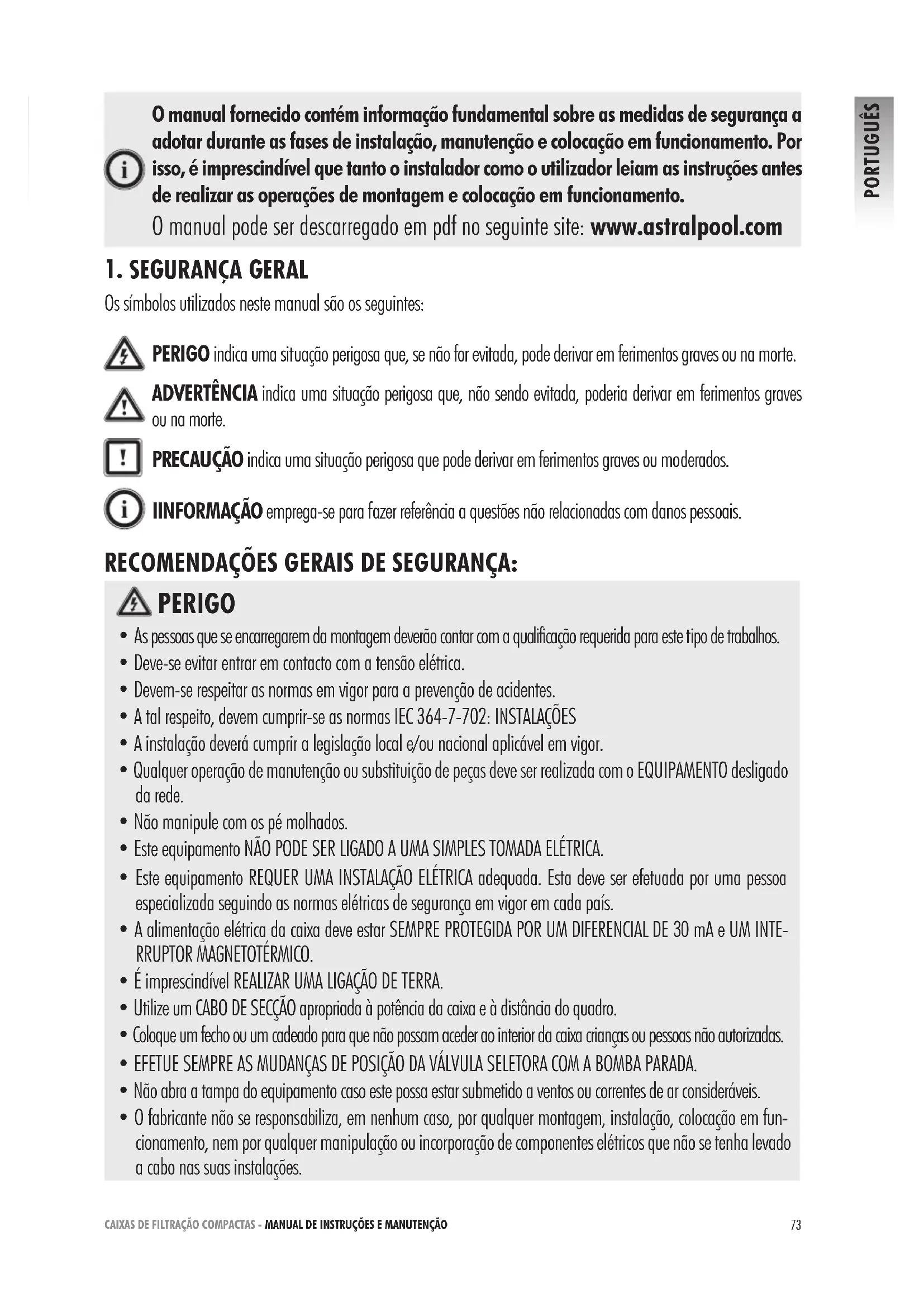 Os símbolos utilizados neste manual são os seguintes: PERIGO indica uma situação perigosa que, se não for evitada, pode derivar em ferimentos graves ou na morte. ADVERTÊNCIA indica uma situação perigosa que, não sendo evitada, poderia derivar em ferimentos graves ou na morte. PRECAUÇÃO indica uma situação perigosa que pode derivar em ferimentos graves ou moderados. IINFORMAÇÃO emprega-se para fazer referência a questões não relacionadas com danos pessoais. O manual fornecido contém informação fundamental sobre as medidas de segurança a adotar durante as fases de instalação, manutenção e colocação em funcionamento. Por isso, é imprescindível que tanto o instalador como o utilizador leiam as instruções antes de realizar as operações de montagem e colocação em funcionamento. O manual pode ser descarregado em pdf no seguinte site: www.astralpool.com PERIGO
