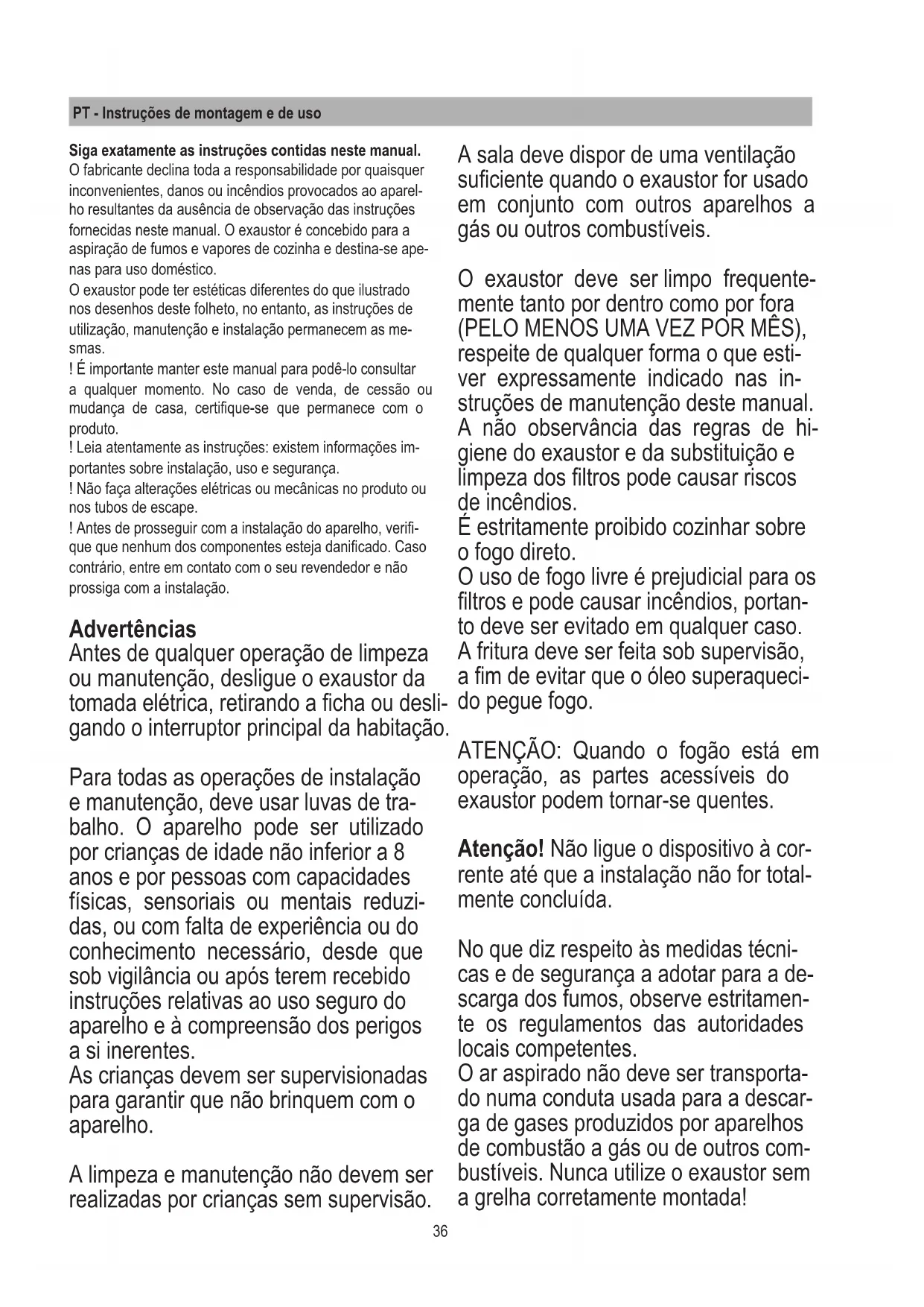 2; IEC/EN 61000-3-3. Dicas para o uso adequado com a nalidade de reduzir o impacto ambiental: quando começa a cozinhar, ligue o exaustor na velocidade mínima, deixando-o ligado por alguns minutos, mesmo após o m da cozedura. Aumente a velocidade apenas em caso de grandes quantidades de fumo e vapor, usando a função booster apenas em casos extre- mos. Para manter o sistema de redução de odores altamente eciente, substitua, quando necessário, o(s) ltro(s) de car- vão. Para manter altamente eciente o ltro de gordura, limpe-o, se necessário. Para maximizar a eciência e minimizar o ruído, use o diâmetro máximo do sistema de canalização indicado neste manual.38 Utilização O exaustor foi feito para ser usado em versão aspirante com evacuação exter- na ou ltrante com recirculação interna. Versão aspirante Os vapores são evacuados para o ex- terior através de um tubo de escape xado à ange de união. O diâmetro do tubo de escape deve ser equivalente ao diâmetro do anel de co- nexão. Atenção! O tubo de descarga não é fornecido e deverá ser comprado. Na parte horizontal, o tubo deve ter uma li- geira inclinação ascendente (cerca 10º) para que possa levar mais facilmente o ar para o exterior. Se o exaustor estiver equipado com ltros de carvão, estes devem ser removidos. Versão ltrante O ar aspirado será desengordurado an- tes de ser re-canalizado na divisão. Para utilizar o exaustor nesta versão, é ne- cessário instalar um sistema de ltragem adicional à base de carbonos ativos. Nota: O ar reciclado através dos ltros de carbono é re-enviado na cozinha através de um duto que transporta o ar de um lado do móvel. Instalação Nota: a instalação deve ser efetuada de modo a que seja sempre garantido o acesso ao exaustor e aos componentes electrónicos em caso de eventuais inter- venções de assistência técnica. ATENÇÃO: Coloque a vasilha que con- tém os componentes electrónicos a uma distância não inferior a 65 cm do fogão a gás ou de qualquer modo a 65 cm do ponto de aspiração do exaustor. RECOMENDAÇÃO: Recomendamos que instale a vasilha contendo os com- ponentes electrónicos a pelo menos 10 cm do chão e a uma distância suciente de todas as fontes de calor (ex: lado de um forno ou fogão). Se as instruções de instalação do dispo- sitivo de cozedura a gás especicarem uma distância maior, será necessário ter isso em conta. Ligação Elétrica A ligação do exaustor à tomada deverá ser efetuada por pessoal qualicado e especializado. A tensão de alimentação deverá corresponder à tensão indicada na etiqueta das características localizada no interior do exaustor. Se não dotada de cha de alimentação, ligue a uma to- mada em conformidade com as normas em vigor, colocada numa área acessível mesmo após a instalação. Se não dotada de cha de alimentação (ligação direta à rede elétrica) ou se a cha não estiver colocada numa área acessível, mesmo após a instalação, aplique um interruptor bipolar de forma a que assegure a desco- nexão completa da rede nas condições da categoria de sobretensão III, em con- formidade com as regras de instalação. Atenção! Antes de voltar a ligar o cir- cuito do exaustor à rede elétrica e de vericar o seu correto funcionamento, certique-se de que o cabo de rede esteja corretamente montado. Montagem Antes de prosseguir com a instalação do aparelho, verique que nenhum dos componentes esteja danicado, caso contrário entre em contato com o seu revendedor e não continue com a insta- lação. Leia também atentamente todas as instruções abaixo.39
