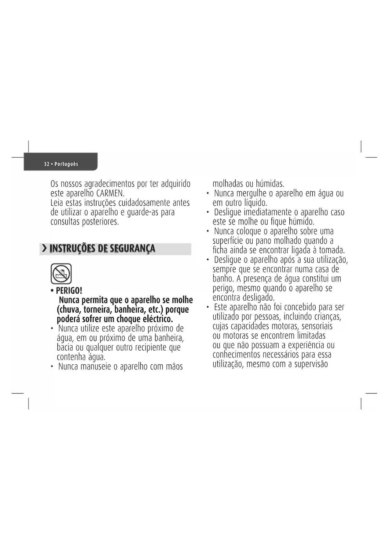 - Este aparelho não foi concebido para ser utilizado por pessoas, incluindo crianças, cujas capacidades motoras, sensoriais ou motoras se encontrem limitadas ou que não possuam a experiência ou conhecimentos necessários para essa utilização, mesmo com a supervisãoPortuguês • 33 de uma pessoa responsável pela sua segurança.