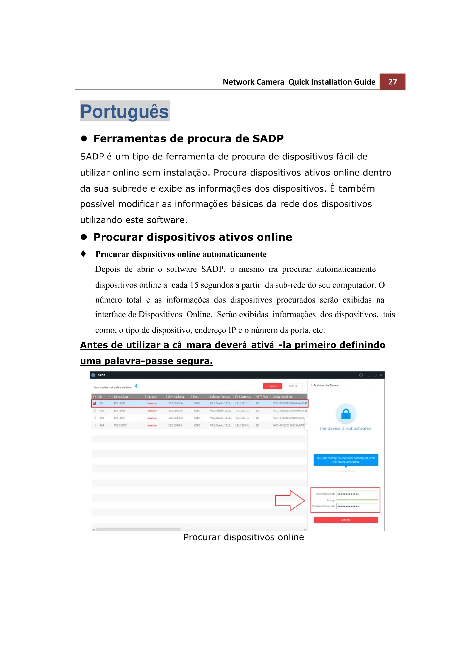 Português Ferramentas de procura de SADP SADP é um tipo de ferramenta de procura de dispositivos fácil de utilizar online sem instalação. Procura dispositivos ativos online dentro da sua subrede e exibe as informações dos dispositivos. É também possível modificar as informações básicas da rede dos dispositivos utilizando este software. Procurar dispositivos ativos online Procurar dispositivos online automaticamente Depois de abrir o software SADP, o mesmo irá procurar automaticamente dispositivos online a cada 15 segundos a partir da sub-rede do seu computador. O número total e as informações dos dispositivos procurados serão exibidas na interface de Dispositivos Online. Serão exibidas informações dos dispositivos, tais como, o tipo de dispositivo, endereço IP e o número da porta, etc. Antes de utilizar a câ mara deverá ativá -la primeiro definindo uma palavra-passe segura. Procurar dispositivos online28 Network Camera Quick Installation Guide