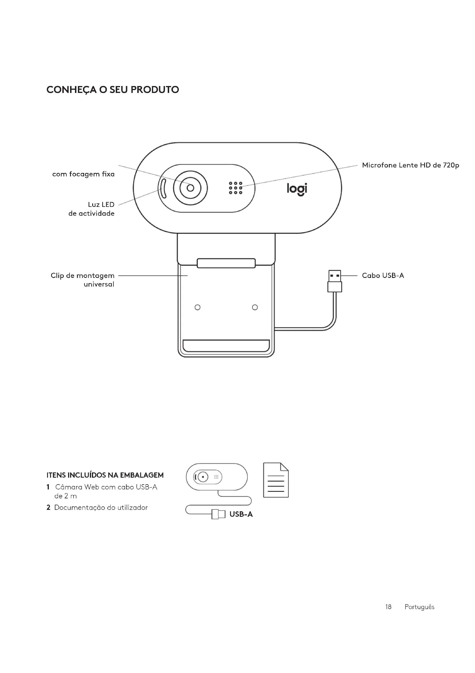 1 Câmara Web com cabo USB-A de2m 2 Documentação do utilizador 18 PortuguêsINSTALAR A CÂMARA WEB 1 Coloque a câmara Web num computador, portátil oumonitor na posição e ângulo que desejar. LIGAR A CÂMARA WEB POR USB-A Ligue o conector USB-A à porta USB-A doseucomputador.
