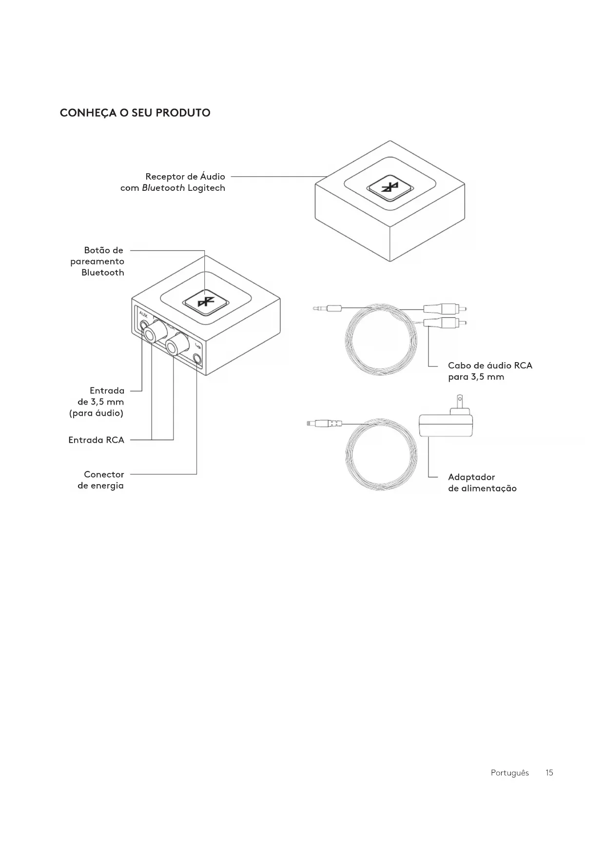 Adaptador dealimentação Cabo de áudio RCA para 3,5 mm Receptor de Áudio comBluetooth Logitech Entrada de3,5mm (paraáudio) Conector deenergia Entrada RCA Botão de pareamento BluetoothPortuguês 16 COMO CONECTAR O RECEPTOR AOS SEUS ALTO-FALANTES AUX RCA