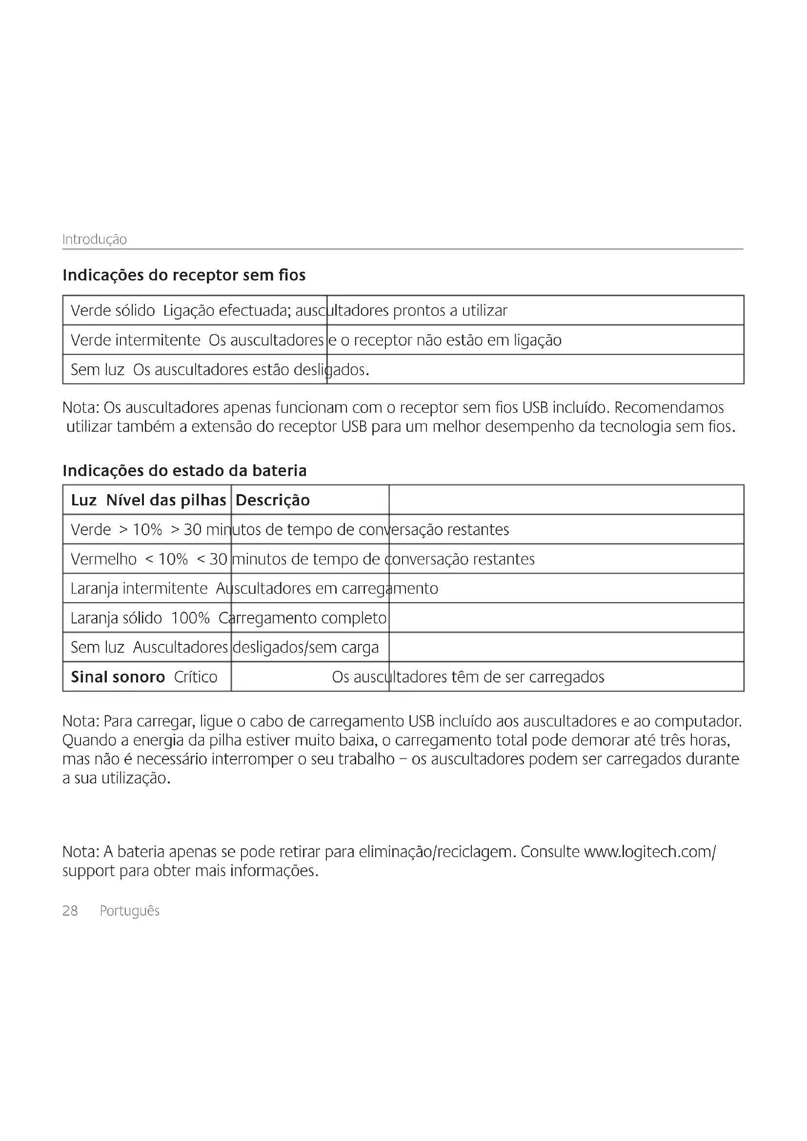 WirelessHeadsetH760 Umnoticaçãosonora conrmaquando osilenciadorestá activadooudesactivado. OscontrolosdemúsicasãocompatíveiscomoWindows Media®PlayereiTunes®.Poderásernecessáriosoftware adicionalparaobteramáximafuncionalidadedetodas ascaracterísticas.Paraobtermaisinformações, visitewww.logitech.com/support. ObrigadoporadquiriroLogitech®WirelessHeadsetH760,concebidoparalheproporcionar chamadasdeInternetemúsica–semosouincómodos.28 Português Introdução Indicaçõesdoreceptorsemos Verdesólido Ligaçãoefectuada;auscultadoresprontosautilizar Verdeintermitente Osauscultadoreseoreceptornãoestãoemligação Semluz Osauscultadoresestãodesligados. Nota:OsauscultadoresapenasfuncionamcomoreceptorsemosUSBincluído.Recomendamos utilizartambémaextensãodoreceptorUSBparaummelhordesempenhodatecnologiasemos. Indicaçõesdoestadodabateria Luz Níveldaspilhas Descrição Verde >10% >30minutosdetempodeconversaçãorestantes Vermelho <10% <30minutosdetempodeconversaçãorestantes Laranjaintermitente Auscultadoresemcarregamento Laranjasólido 100% Carregamentocompleto Semluz Auscultadoresdesligados/semcarga Sinalsonoro Crítico Osauscultadorestêmdesercarregados Nota:Paracarregar,ligueocabodecarregamentoUSBincluídoaosauscultadoreseaocomputador. Quandoaenergiadapilhaestivermuitobaixa,ocarregamentototalpodedemoraratétrêshoras, masnãoénecessáriointerromperoseutrabalho–osauscultadorespodemsercarregadosdurante asuautilização. Nota:Abateriaapenassepoderetirarparaeliminação/reciclagem.Consultewww.logitech.com/ supportparaobtermaisinformações.Português 29 Logitech