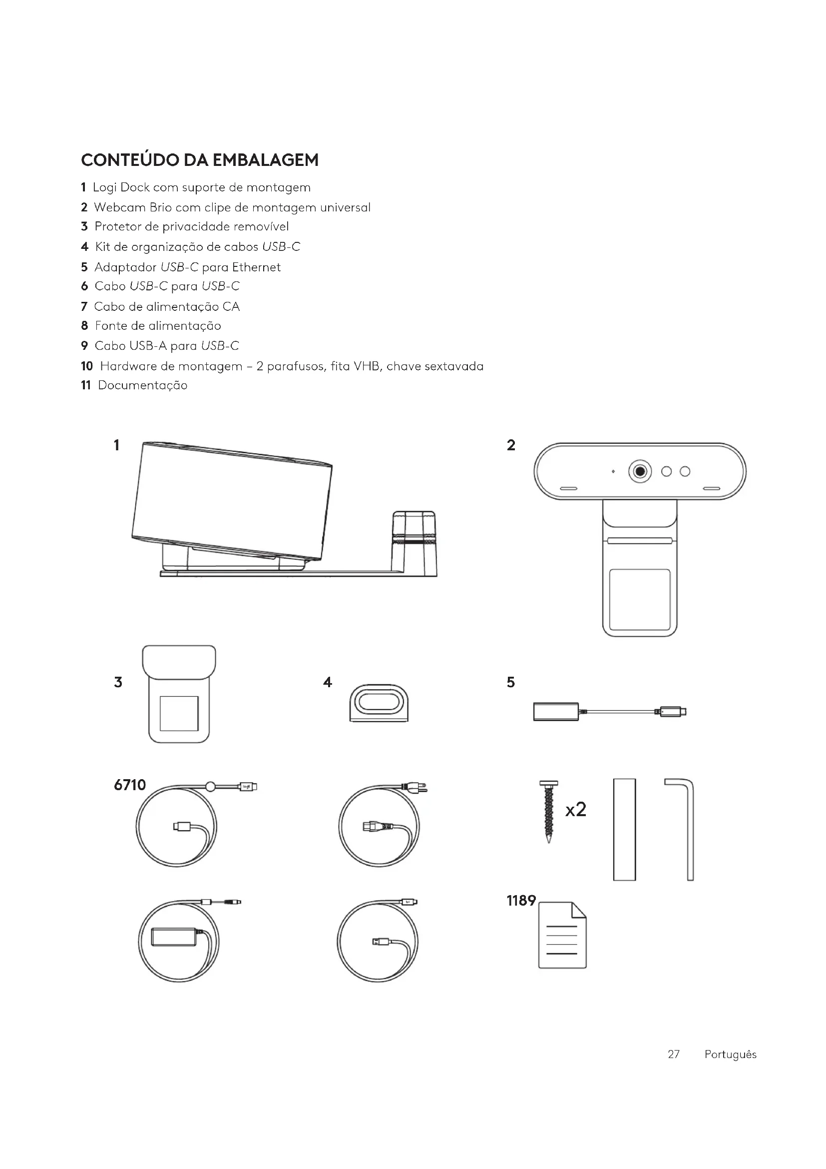 1 Logi Dock com suporte de montagem 2 Webcam Brio com mola de xação universal 3 Tampa de privacidade com xação 4 Kit de organizador de cabo USB-C 5 Adaptador de USB-C para Ethernet 6 Cabo USB-C para USB-C 7 Cabo de alimentação AC 8 Fonte de alimentação 9 Cabo USB-A para USB-C 10 Hardware de montagem – x2 parafusos, ta VHB, chave sextavada 11 Documentação 59 Português1 2 3