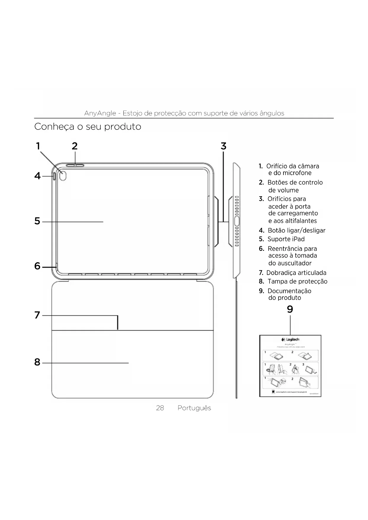 - Peças sobressalentes (se disponíveis) Aceda a: www.logitech.com/support/anyangle-i632 Português AnyAngle - Estojo de protecção com suporte de vários ângulos Resolução de problemas O meu iPad não é activado quando abro o folio e não entra em modo de suspensão quando o fecho.