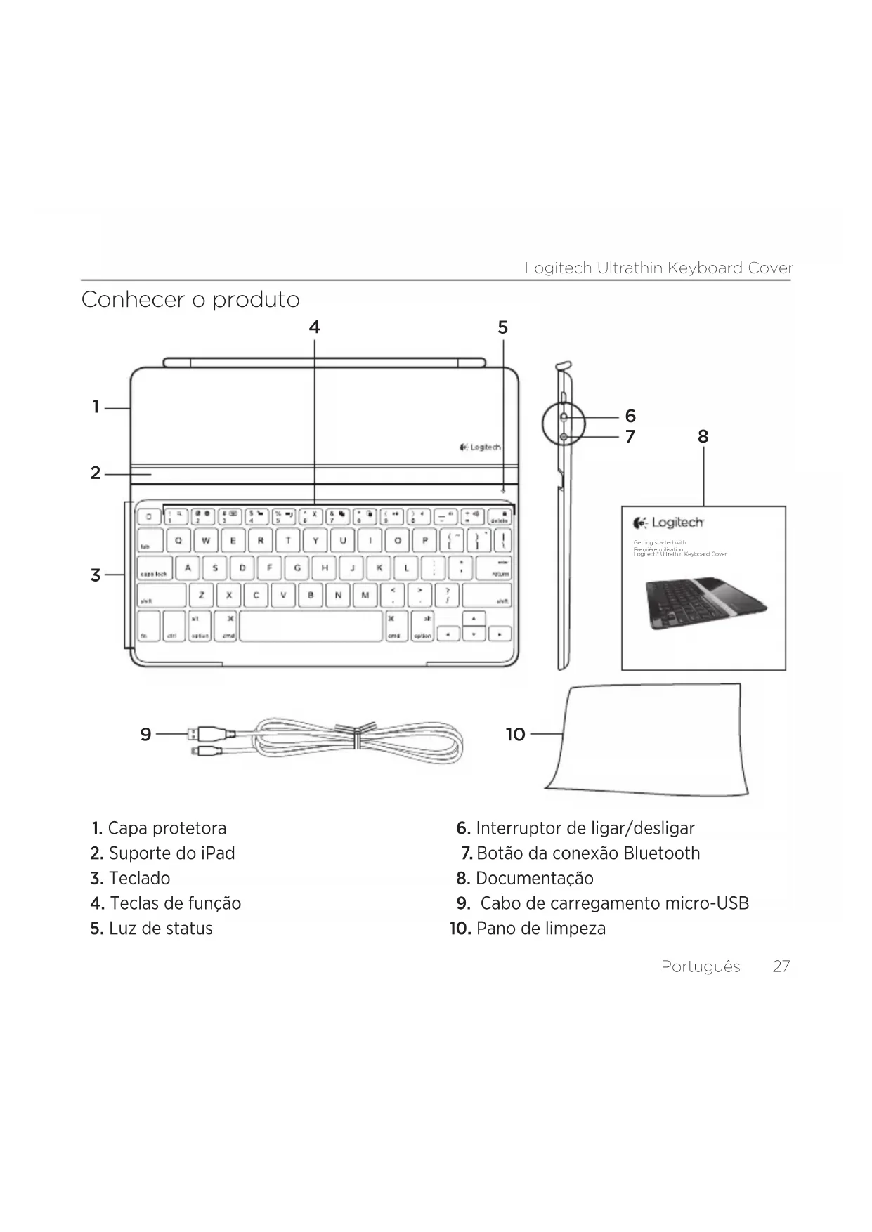 - O Keyboard Cover entra no modo de dormir se estiver ligado e não em uso. Pressione qualquer tecla para despertá-lo. USBLogitech Ultrathin Keyboard Cover 30 Português Visitar a Central de Produtos Mais informações e suporte estão disponíveis on-line para o produto. Reserve um momento para visitar a Central de Produtos e saber mais sobre o novo Keyboard Cover. Procure artigos on-line para obter ajuda de configuração, dicas de uso ou informações sobre recursos adicionais. Comunique-se com outros usuários em nossos fóruns da comunidade para obter conselhos, fazer perguntas e compartilhar soluções. Na Central de Produtos, você irá encontrar uma variada seleção de conteúdo: