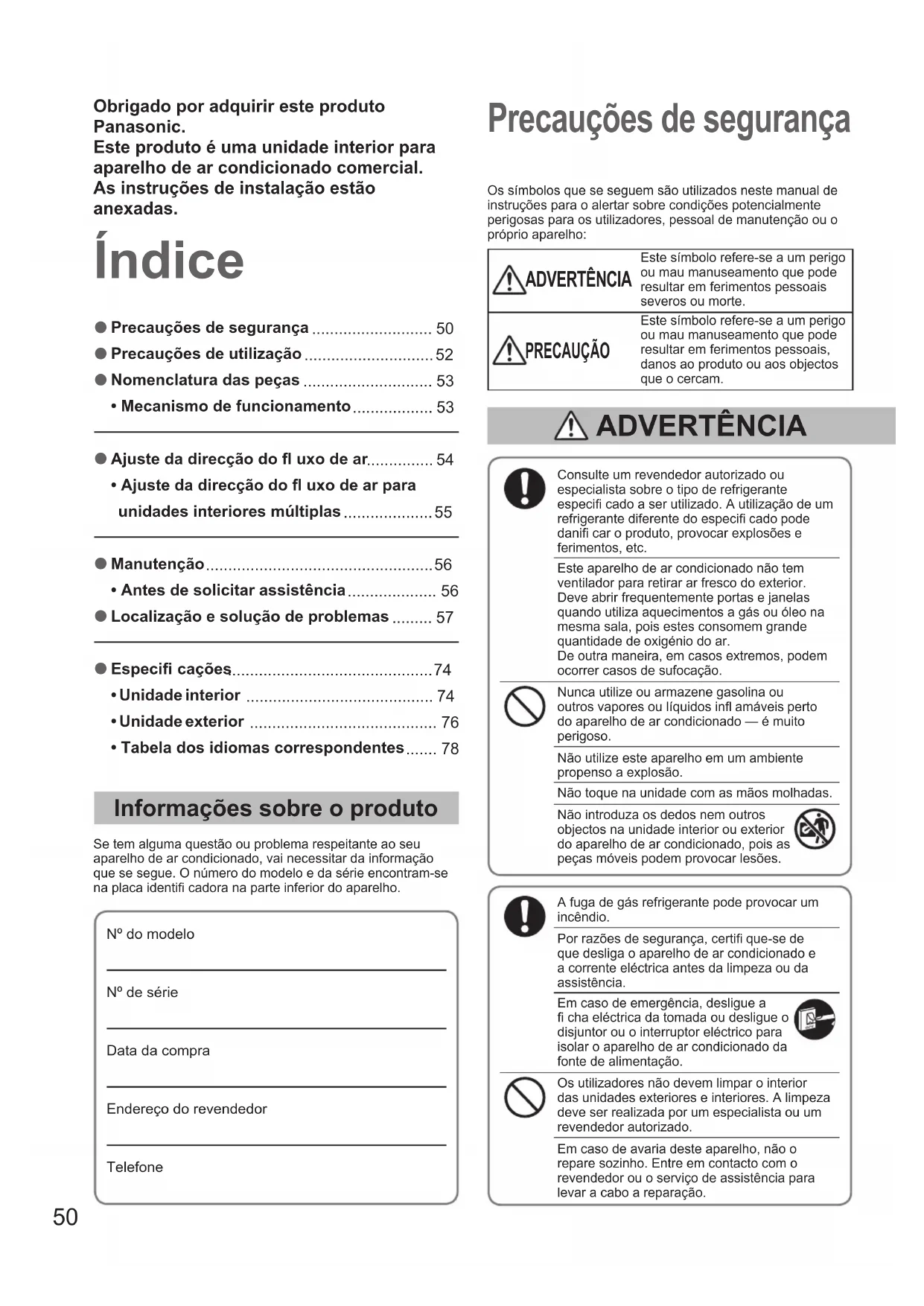 - • Tabela dos idiomas correspondentes Índice Precauções de segurança Informações sobre o produto Se tem alguma questão ou problema respeitante ao seu aparelho de ar condicionado, vai necessitar da informação que se segue. O número do modelo e da série encontram-se na placa identifi cadora na parte inferior do aparelho.Nº do modelo Nº de série Data da compraEndereço do revendedorTelefoneConsulte um revendedor autorizado ou especialista sobre o tipo de refrigerante especifi cado a ser utilizado. A utilização de um refrigerante diferente do especifi cado pode danifi car o produto, provocar explosões e ferimentos, etc.Este aparelho de ar condicionado não tem ventilador para retirar ar fresco do exterior. Deve abrir frequentemente portas e janelas quando utiliza aquecimentos a gás ou óleo na mesma sala, pois estes consomem grande quantidade de oxigénio do ar. De outra maneira, em casos extremos, podem ocorrer casos de sufocação.Nunca utilize ou armazene gasolina ou outros vapores ou líquidos infl amáveis perto do aparelho de ar condicionado — é muito perigoso.Não utilize este aparelho em um ambiente propenso a explosão.Não toque na unidade com as mãos molhadas.Não introduza os dedos nem outros objectos na unidade interior ou exterior do aparelho de ar condicionado, pois as peças móveis podem provocar lesões.A fuga de gás refrigerante pode provocar um incêndio.Por razões de segurança, certifi que-se de que desliga o aparelho de ar condicionado e a corrente eléctrica antes da limpeza ou da assistência.Em caso de emergência, desligue a fi cha eléctrica da tomada ou desligue o disjuntor ou o interruptor eléctrico para isolar o aparelho de ar condicionado da fonte de alimentação.Os utilizadores não devem limpar o interior das unidades exteriores e interiores. A limpeza deve ser realizada por um especialista ou um revendedor autorizado.Em caso de avaria deste aparelho, não o repare sozinho. Entre em contacto com o revendedor ou o serviço de assistência para levar a cabo a reparação.Os símbolos que se seguem são utilizados neste manual de instruções para o alertar sobre condições potencialmente perigosas para os utilizadores, pessoal de manutenção ou o próprio aparelho: ADVERTÊNCIA Este símbolo refere-se a um perigo ou mau manuseamento que pode resultar em ferimentos pessoais severos ou morte. PRECAUÇÃO Este símbolo refere-se a um perigo ou mau manuseamento que pode resultar em ferimentos pessoais, danos ao produto ou aos objectos que o cercam. ADVERTÊNCIA Obrigado por adquirir este produto Panasonic.Este produto é uma unidade interior para aparelho de ar condicionado comercial.As instruções de instalação estão anexadas. OI00F569616EU.indb50OI00F569616EU.indb50 2014/02/289:31:252014/02/289:31:2551 PORTUGUÊS Este equipamento pretende ser usado por peritos ou utilizadores com formação em lojas, na indústria leve e em quintas, ou para utilização comercial por pessoas não especializadas. Este aparelho pode ser utilizado por crianças de 8 anos de idade e acima e por pessoas com capacidades físicas, sensoriais e mentais reduzidas ou com falta de experiência e conhecimento se os mesmos forem supervisionados ou instruídos sobre a utilização do aparelho de maneira segura e compreendam os perigos envolvidos. Mantenha o alarme de incêndio e a saída de ar a pelo menos 1,5 m da unidade. Não arrefeça ou aqueça demasiado a sala quando estiverem presentes bebés ou pessoas inválidas. Não ligue e desligue o aparelho de ar condicionado utilizando o interruptor principal. Utilize o botão de operação ON/OFF. Não coloque nada na saída de ar da unidade exterior. É muito perigoso devido à alta velocidade de rotação do ventilador. Não toque na entrada de ar ou nas pás de alumínio afi adas da unidade exterior. Pode sofrer ferimentos. Não cole nenhum objecto na CAIXA DA VENTOINHA. Pode sofrer ferimentos e danifi car a unidade. Providencie uma tomada eléctrica para ser utilizada exclusivamente para cada unidade, bem como um interruptor para a fonte de alimentação, um disjuntor de circuito e um disjuntor de fugas de ligação à terra para protecção de sobrecorrente na linha exclusiva. Providencie uma tomada eléctrica exclusivamente para cada unidade e integrar meios de desactivação total com separação de contacto em todos os pólos da instalação eléctrica fi xa, conforme as normas de fi ação. Para impedir possíveis perigos devido a falha do isolamento, tem de ligar a unidade à massa. De modo a evitar o sobreaquecimento e incêndios, não utilize cabos modifi cados, cabos partilhados, extensões eléctricas nem cabos não especifi cados. Numa situação de anomalia/avaria do produto, interrompa o seu uso e retire a fi cha da tomada ou e o disjuntor. (Risco de fumo/incêndio/choque eléctrico) Exemplos de anormalidade/avaria: p. 78