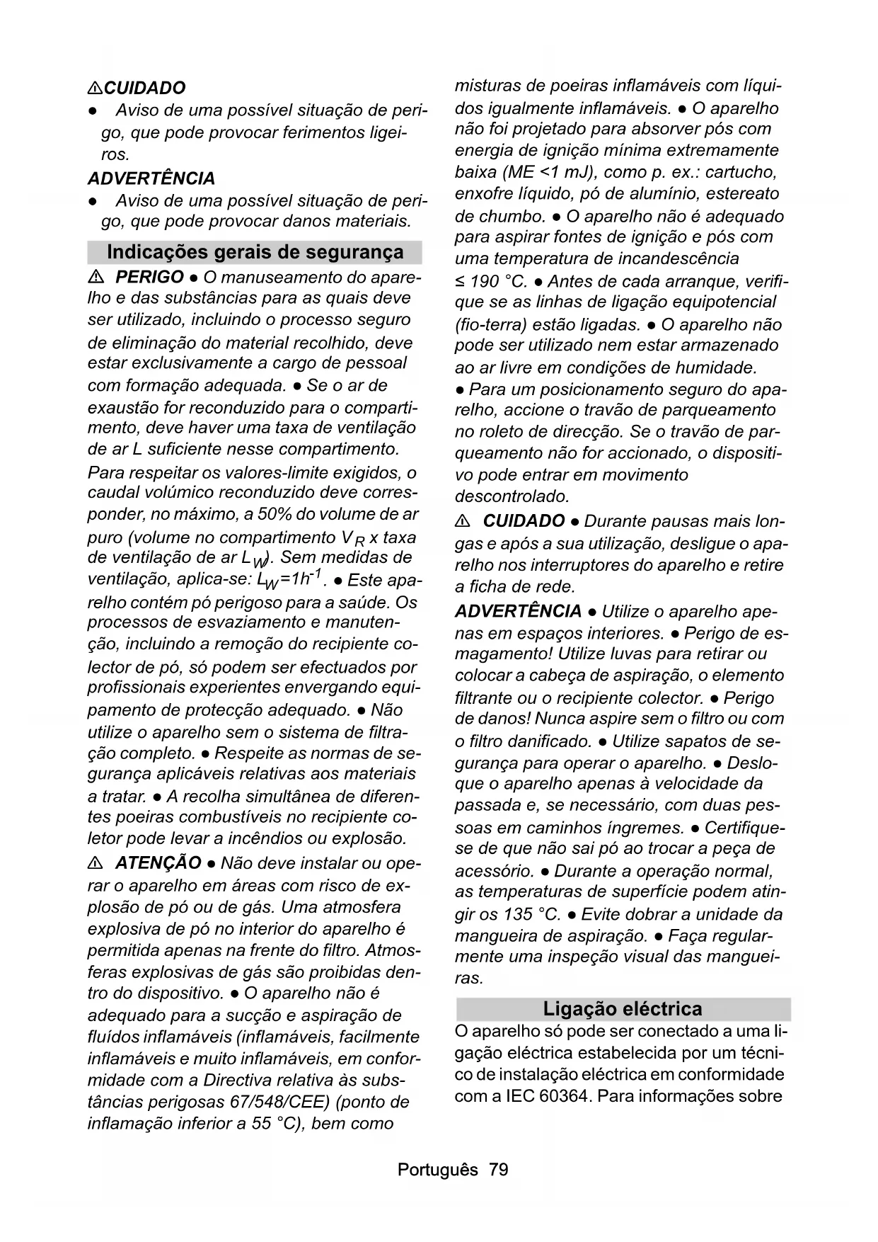 ATENÇA O Não deve instalar ou operar o aparelho em和地区 com risco de explosão de po ou de gás. Uma atmosalera explosiva de po no interior do aparinho é permitida apenas na fronte do过滤. Atmosferas explosivas de gás são proibidas dentro do disposicao. O aparinho não é adequado para a sucção e aspiração de fluidos inflamáveis (inflamáveis, fácilmente inflamáveis e muito inflamáveis, em conformidade com a Directa relativa àssubstâncias perigosas 67/548/CEE) (ponto de inflamação inferior a 55^ ), bem como