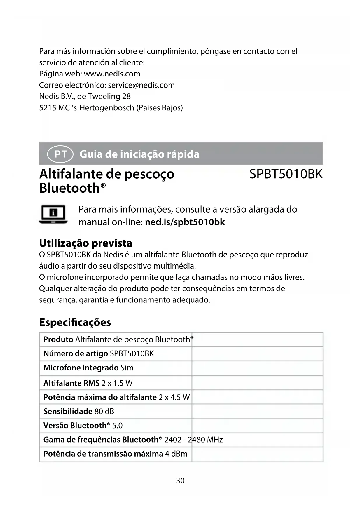 duas vezes.34 Este produto foi concebido apenas para uso privado (uso doméstico normal). A Nedis não é responsável pelo desgaste, defeitos e/ou danos causados pela utilização comercial do produto. Declaração de conformidade A Nedis B.V. declara, na qualidade de fabricante, que o produto SPBT5010BK da nossa marca Nedis