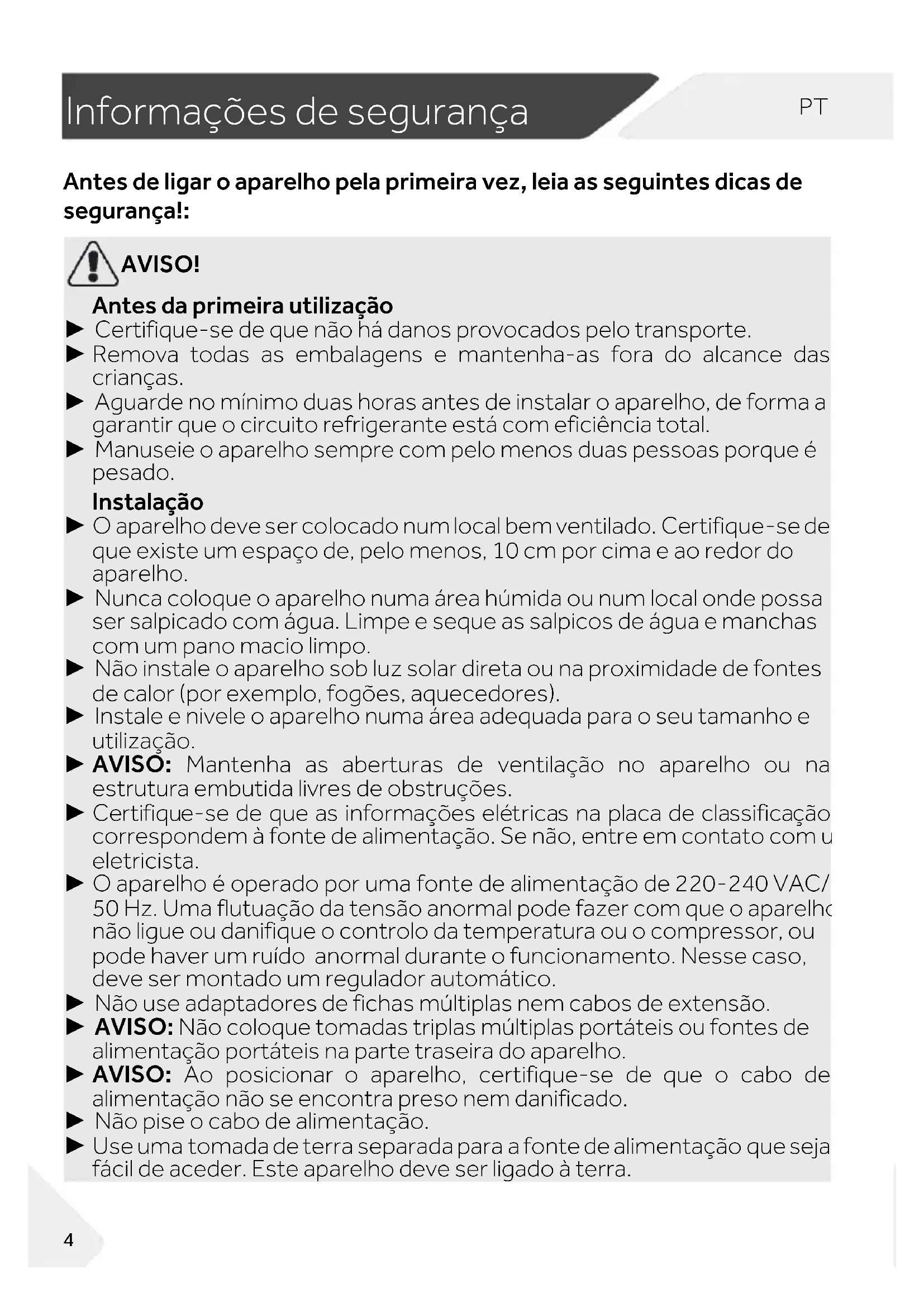 AVISO! Antes da primeira utilização ► Certifique-se de que não há danos provocados pelo transporte. ► Remova todas as embalagens e mantenha-as fora do alcance das crianças. ► Aguarde no mínimo duas horas antes de instalar o aparelho, de forma a garantir que o circuito refrigerante está com eficiência total. ► Manuseie o aparelho sempre com pelo menos duas pessoas porque é pesado. Instalação ► O aparelho deve ser colocado num local bem ventilado. Certifique-se de que existe um espaço de, pelo menos, 10 cm por cima e ao redor do aparelho. ► Nunca coloque o aparelho numa área húmida ou num local onde possa ser salpicado com água. Limpe e seque as salpicos de água e manchas com um pano macio limpo. ► Não instale o aparelho sob luz solar direta ou na proximidade de fontes de calor (por exemplo, fogões, aquecedores). ► Instale e nivele o aparelho numa área adequada para o seu tamanho e utilização. ► AVISO: Mantenha as aberturas de ventilação no aparelho ou na estrutura embutida livres de obstruções. ► Certifique-se de que as informações elétricas na placa de classificação correspondem à fonte de alimentação. Se não, entre em contato com um eletricista. ► O aparelho é operado por uma fonte de alimentação de 220-240 VAC/ 50 Hz. Uma flutuação da tensão anormal pode fazer com que o aparelho não ligue ou danifique o controlo da temperatura ou o compressor, ou pode haver um ruído anormal durante o funcionamento. Nesse caso, deve ser montado um regulador automático. ► Não use adaptadores de fichas múltiplas nem cabos de extensão. ► AVISO: Não coloque tomadas triplas múltiplas portáteis ou fontes de alimentação portáteis na parte traseira do aparelho. ► AVISO: Ao posicionar o aparelho, certifique-se de que o cabo de alimentação não se encontra preso nem danificado. ► Não pise o cabo de alimentação. ► Use uma tomada de terra separada para a fonte de alimentação que seja fácil de aceder. Este aparelho deve ser ligado à terra.PT Informações de segurança