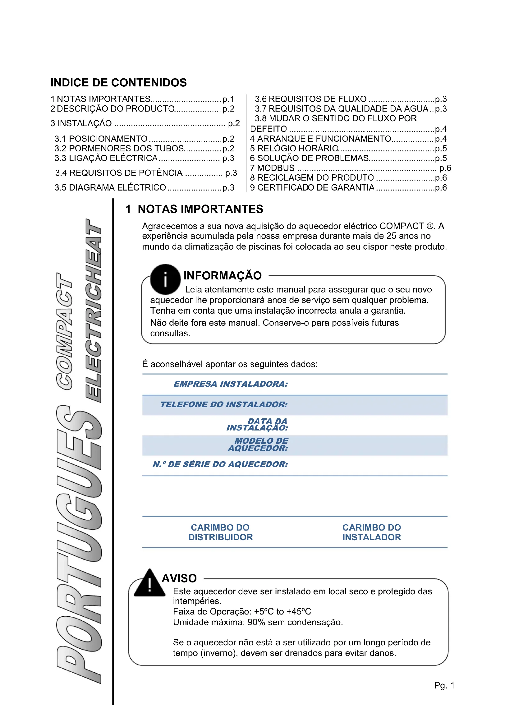 1 NOTAS IMPORTANTES Agradecemos a sua nova aquisição do aquecedor eléctrico COMPACT ®. A experiência acumulada pela nossa empresa durante mais de 25 anos no mundo da climatização de piscinas foi colocada ao seu dispor neste produto.