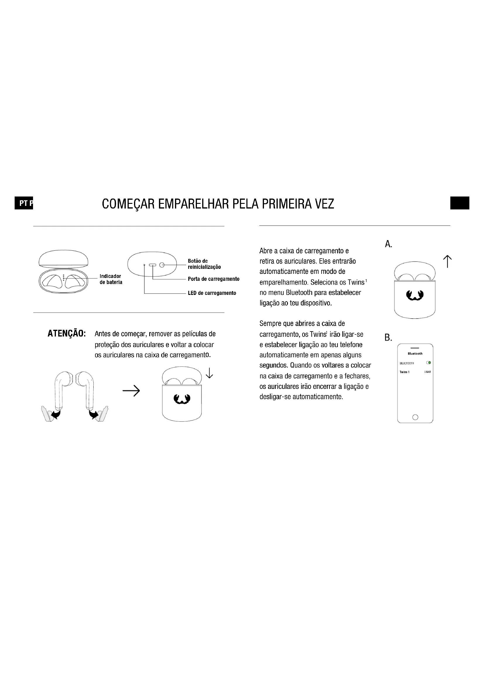 PT PT ATENÇÃO: Antes de começar, remover as películas de proteção dos auriculares e voltar a colocar os auriculares na caixa de carregament