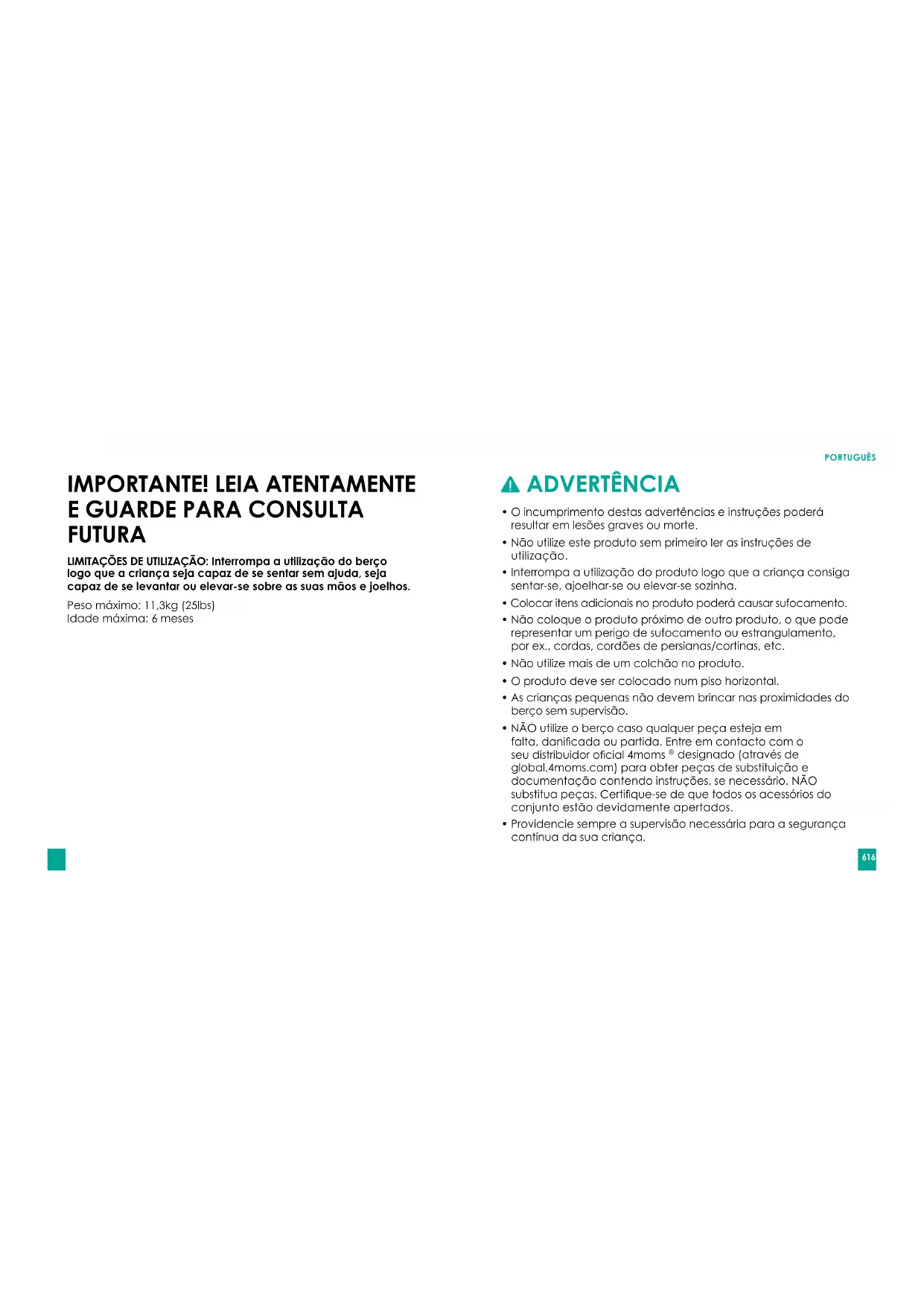 FUTURA LIMITAÇÕES DE UTILIZAÇÃO: Interrompa a utilização do berço logo que a criança seja capaz de se sentar sem ajuda, seja capaz de se levantar ou elevar-se sobre as suas mãos e joelhos. Pesomáximo:11,3kg(25lbs) Idade máxima: 6 meses ADVERTÊNCIA