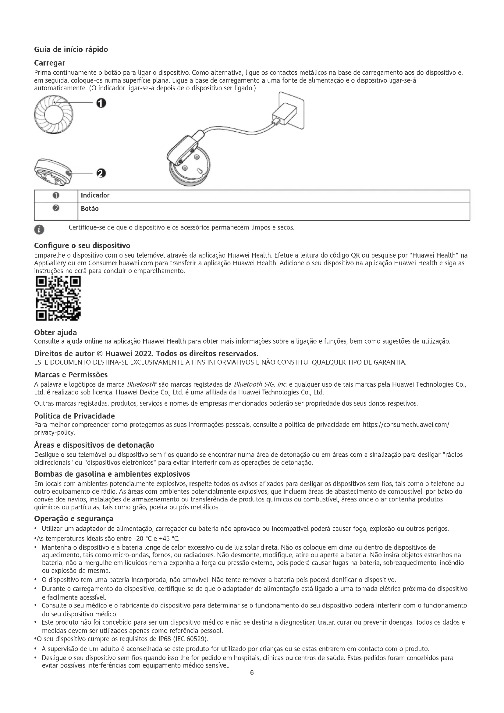 BotãoCertique-se de que o dispositivo e os acessórios permanecem limpos e secos. Congure o seu dispositivo Emparelhe o dispositivo com o seu telemóvel através da aplicação Huawei Health. Efetue a leitura do código QR ou pesquise por "Huawei Health" na AppGallery ou em Consumer.huawei.com para transferir a aplicação Huawei Health. Adicione o seu dispositivo na aplicação Huawei Health e siga as instruções no ecrã para concluir o emparelhamento. Obter ajuda Consulte a ajuda online na aplicação Huawei Health para obter mais informações sobre a ligação e funções, bem como sugestões de utilização. Direitos de autor © Huawei 2022. Todos os direitos reservados. ESTE DOCUMENTO DESTINA-SE EXCLUSIVAMENTE A FINS INFORMATIVOS E NÃO CONSTITUI QUALQUER TIPO DE GARANTIA. Marcas e Permissões A palavra e logótipos da marca Bluetooth