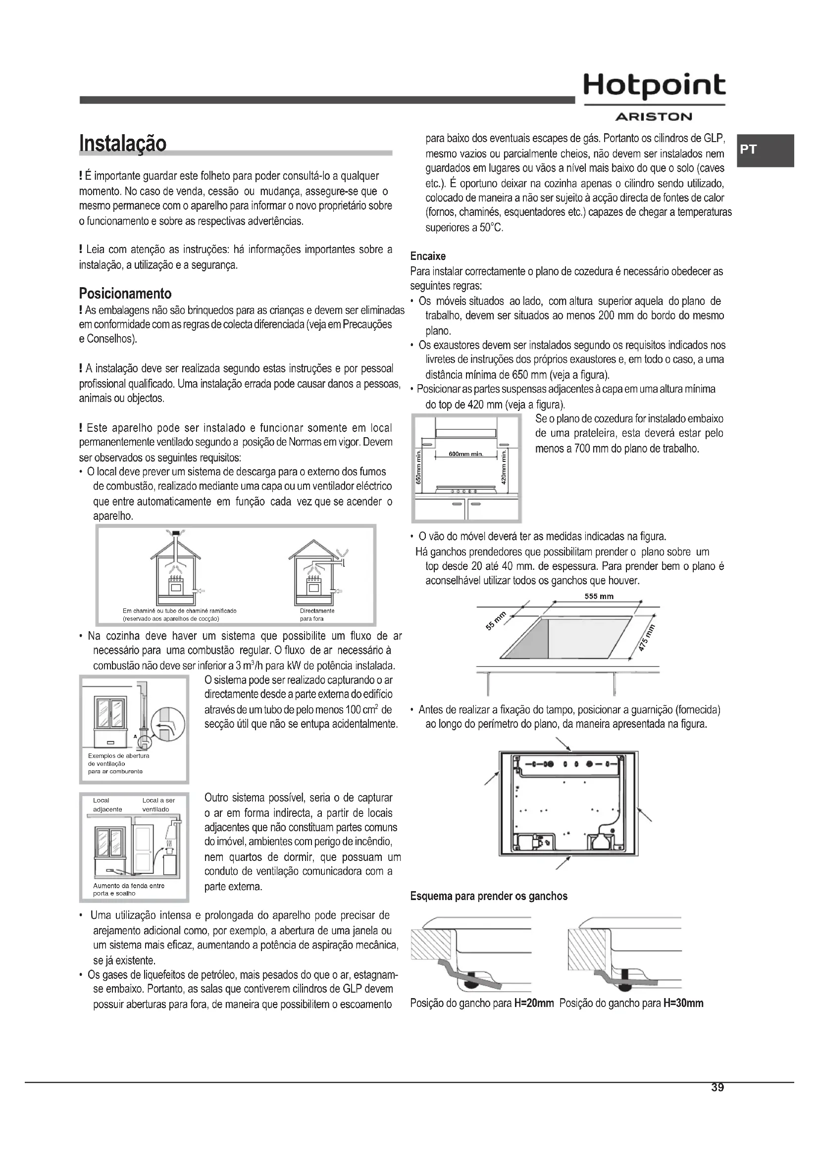 Instalação ! É importante guardar este folheto para poder consultá-lo a qualquer momento. No caso de venda, cessão ou mudança, assegure-se que o mesmo permanece com o aparelho para informar o novo proprietário sobre o funcionamento e sobre as respectivas advertências. ! Leia com atenção as instruções: há informações importantes sobre a instalação, a utilização e a segurança. Posicionamento ! As embalagens não são brinquedos para as crianças e devem ser eliminadas em conformidade com as regras de colecta diferenciada (veja em Precauções e Conselhos). ! A instalação deve ser realizada segundo estas instruções e por pessoal prossional qualicado. Uma instalação errada pode causar danos a pessoas, animais ou objectos. ! Este aparelho pode ser instalado e funcionar somente em local permanentemente ventilado segundo a posição de Normas em vigor. Devem ser observados os seguintes requisitos: