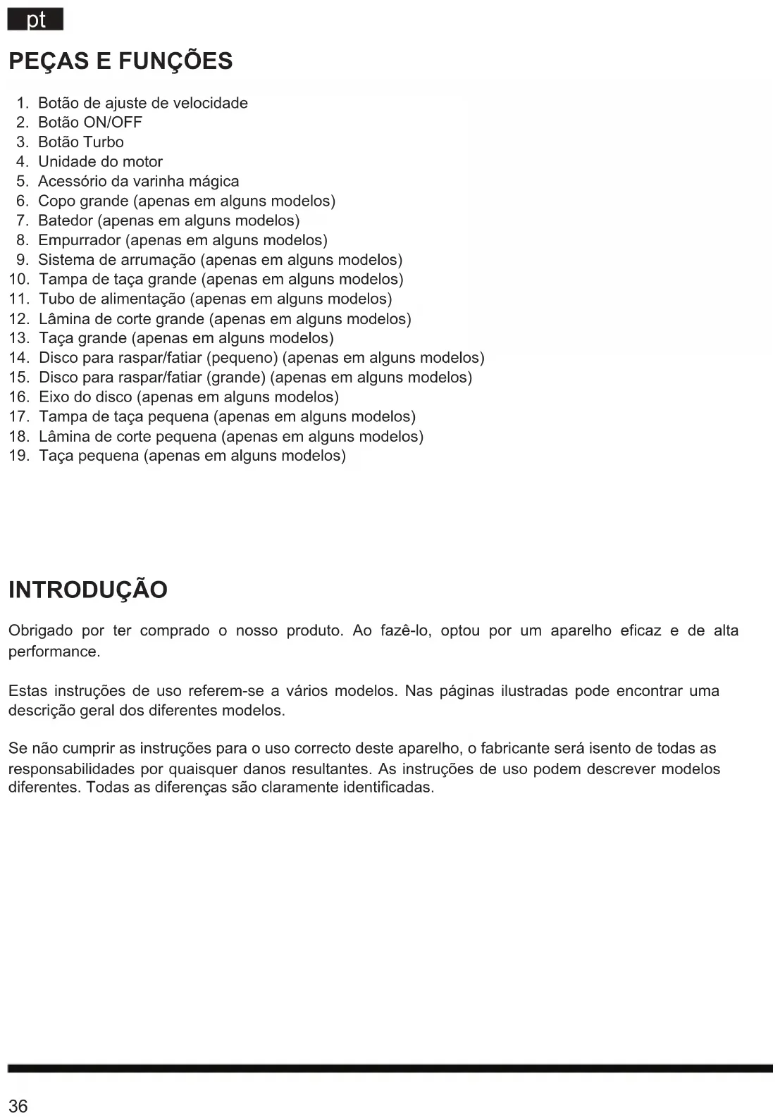 INTRODUÇÃO Obrigado por ter comprado o nosso produto. Ao fazê-lo, optou por um aparelho ecaz e de alta performance. Estas instruções de uso referem-se a vários modelos. Nas páginas ilustradas pode encontrar uma descrição geral dos diferentes modelos. Se não cumprir as instruções para o uso correcto deste aparelho, o fabricante será isento de todas as responsabilidades por quaisquer danos resultantes. As instruções de uso podem descrever modelos diferentes. Todas as diferenças são claramente identicadas.37