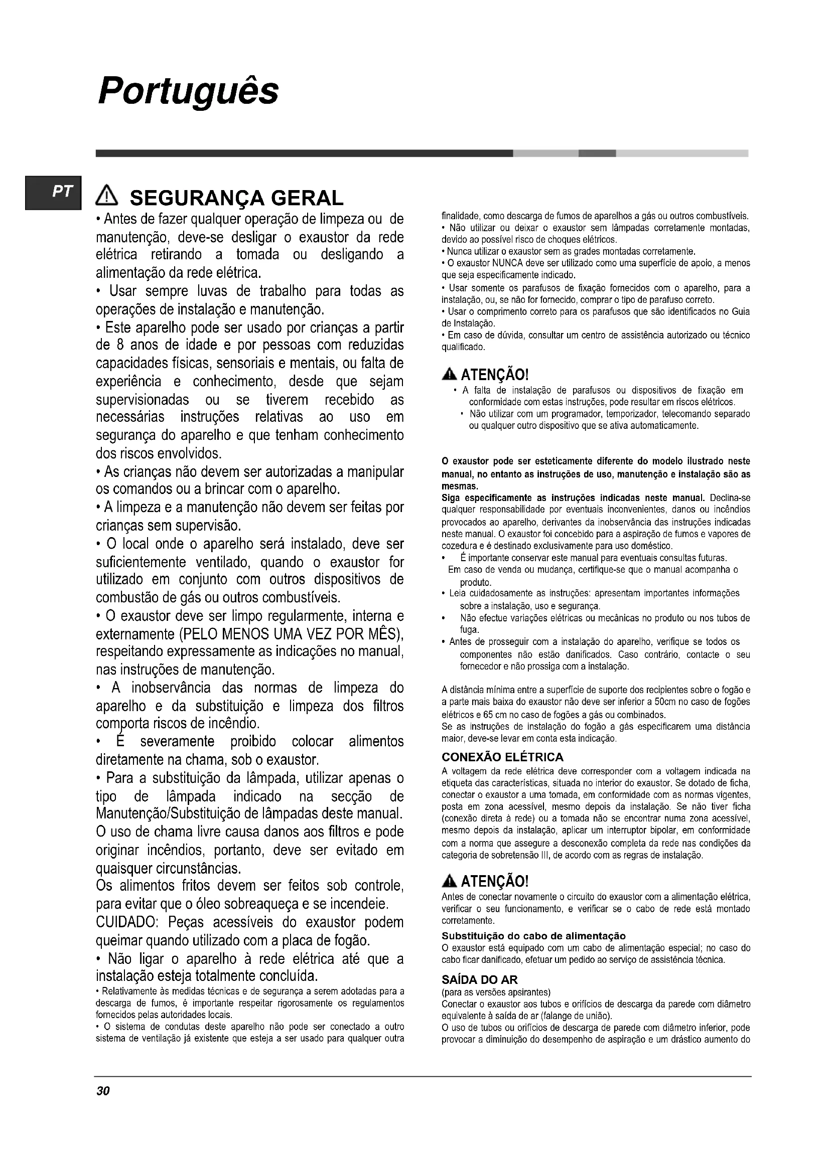 A voltagem da rede elétrica deve corresponder com a voltagem indicada na etiqueta das características, situada no interior do exaustor. Se dotado de ficha, conectar o exaustor a uma tomada, em conformidade com as normas vigentes, posta em zona acessível, mesmo depois da instalação. Se não tiver ficha (conexão direta à rede) ou a tomada não se encontrar numa zona acessível, mesmo depois da instalação, aplicar um interruptor bipolar, em conformidade com a norma que assegure a desconexão completa da rede nas condições da categoria de sobretensão III, de acordo com as regras de instalação. ATENÇÃO! Antes de conectar novamente o circuito do exaustor com a alimentação elétrica, verificar o seu funcionamento, e verificar se o cabo de rede está montado corretamente. Substituição do cabo de alimentação O exaustor está equipado com um cabo de alimentação especial; no caso do cabo ficar danificado, efetuar um pedido ao serviço de assistência técnica.