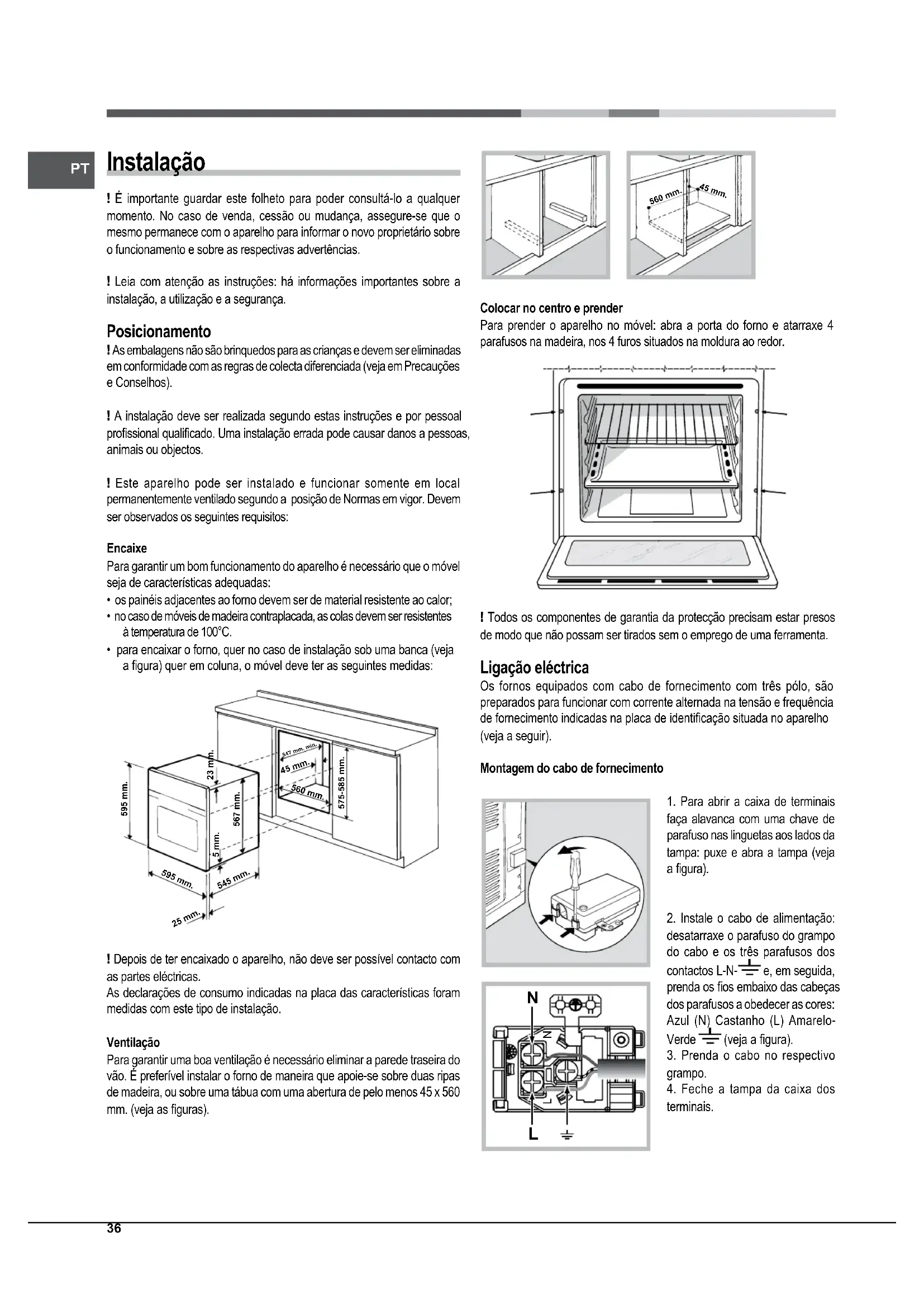 - para encaixar o forno, quer no caso de instalação sob uma banca (veja a gura) quer em coluna, o móvel deve ter as seguintes medidas: 595 mm. 595 mm. 25 mm. 545 mm.5 mm.567 mm.23 mm.575-585 mm.45 mm.560 mm. 547 mm. min. ! Depois de ter encaixado o aparelho, não deve ser possível contacto com as partes eléctricas. As declarações de consumo indicadas na placa das características foram medidas com este tipo de instalação. Ventilação Para garantir uma boa ventilação é necessário eliminar a parede traseira do vão. É preferível instalar o forno de maneira que apoie-se sobre duas ripas de madeira, ou sobre uma tábua com uma abertura de pelo menos 45 x 560 mm. (veja as guras). 560 mm. 45 mm. Colocar no centro e prender Para prender o aparelho no móvel: abra a porta do forno e atarraxe 4 parafusos na madeira, nos 4 furos situados na moldura ao redor. ! Todos os componentes de garantia da protecção precisam estar presos de modo que não possam ser tirados sem o emprego de uma ferramenta. Ligação eléctrica Os fornos equipados com cabo de fornecimento com três pólo, são preparados para funcionar com corrente alternada na tensão e frequência de fornecimento indicadas na placa de identicação situada no aparelho (veja a seguir). Montagem do cabo de fornecimento