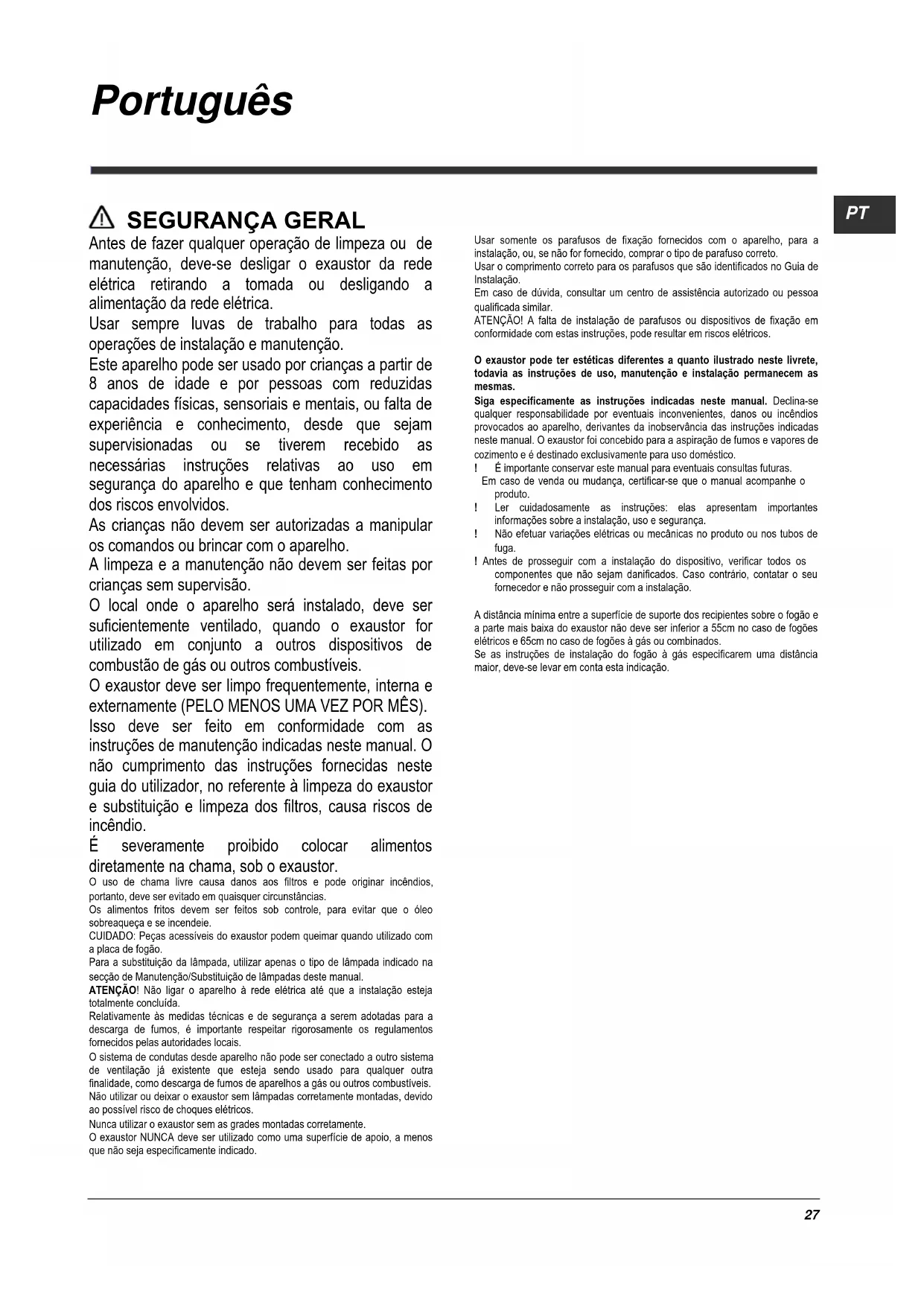 Antes de fazer qualquer operação de limpeza ou de manutenção, deve-se desligar o exaustor da rede elétrica retirando a tomada ou desligando a alimentação da rede elétrica. Usar sempre luvas de trabalho para todas as operações de instalação e manutenção. Este aparelho pode ser usado por crianças a partir de 8 anos de idade e por pessoas com reduzidas capacidades físicas, sensoriais e mentais, ou falta de experiência e conhecimento, desde que sejam supervisionadas ou se tiverem recebido as necessárias instruções relativas ao uso em segurança do aparelho e que tenham conhecimento dos riscos envolvidos. As crianças não devem ser autorizadas a manipular os comandos ou brincar com o aparelho. A limpeza e a manutenção não devem ser feitas por crianças sem supervisão. O local onde o aparelho será instalado, deve ser suficientemente ventilado, quando o exaustor for utilizado em conjunto a outros dispositivos de combustão de gás ou outros combustíveis. O exaustor deve ser limpo frequentemente, interna e externamente (PELO MENOS UMA VEZ POR MÊS). Isso deve ser feito em conformidade com as instruções de manutenção indicadas neste manual. O não cumprimento das instruções fornecidas neste guia do utilizador, no referente à limpeza do exaustor e substituição e limpeza dos filtros, causa riscos de incêndio. É severamente proibido colocar alimentos diretamente na chama, sob o exaustor. O uso de chama livre causa danos aos filtros e pode originar incêndios, portanto, deve ser evitado em quaisquer circunstâncias. Os alimentos fritos devem ser feitos sob controle, para evitar que o óleo sobreaqueça e se incendeie. CUIDADO: Peças acessíveis do exaustor podem queimar quando utilizado com a placa de fogão. Para a substituição da lâmpada, utilizar apenas o tipo de lâmpada indicado na secção de Manutenção/Substituição de lâmpadas deste manual. ATENÇÃO! Não ligar o aparelho à rede elétrica até que a instalação esteja totalmente concluída. Relativamente às medidas técnicas e de segurança a serem adotadas para a descarga de fumos, é importante respeitar rigorosamente os regulamentos fornecidos pelas autoridades locais. O sistema de condutas desde aparelho não pode ser conectado a outro sistema de ventilação já existente que esteja sendo usado para qualquer outra finalidade, como descarga de fumos de aparelhos a gás ou outros combustíveis. Não utilizar ou deixar o exaustor sem lâmpadas corretamente montadas, devido ao possível risco de choques elétricos. Nunca utilizar o exaustor sem as grades montadas corretamente. O exaustor NUNCA deve ser utilizado como uma superfície de apoio, a menos que não seja especificamente indicado. Usar somente os parafusos de fixação fornecidos com o aparelho, para a instalação, ou, se não for fornecido, comprar o tipo de parafuso correto. Usar o comprimento correto para os parafusos que são identificados no Guia de Instalação. Em caso de dúvida, consultar um centro de assistência autorizado ou pessoa qualificada similar. ATENÇÃO! A falta de instalação de parafusos ou dispositivos de fixação em conformidade com estas instruções, pode resultar em riscos elétricos. O exaustor pode ter estéticas diferentes a quanto ilustrado neste livrete, todavia as instruções de uso, manutenção e instalação permanecem as mesmas. Siga especificamente as instruções indicadas neste manual. Declina-se qualquer responsabilidade por eventuais inconvenientes, danos ou incêndios provocados ao aparelho, derivantes da inobservância das instruções indicadas neste manual. O exaustor foi concebido para a aspiração de fumos e vapores de cozimento e é destinado exclusivamente para uso doméstico. ! É importante conservar este manual para eventuais consultas futuras. Em caso de venda ou mudança, certificar-se que o manual acompanhe o produto. ! Ler cuidadosamente as instruções: elas apresentam importantes informações sobre a instalação, uso e segurança. ! Não efetuar variações elétricas ou mecânicas no produto ou nos tubos de fuga. ! Antes de prosseguir com a instalação do dispositivo, verificar todos os componentes que não sejam danificados. Caso contrário, contatar o seu fornecedor e não prosseguir com a instalação. A distância mínima entre a superfície de suporte dos recipientes sobre o fogão e a parte mais baixa do exaustor não deve ser inferior a 55cm no caso de fogões elétricos e 65cm no caso de fogões à gás ou combinados. Se as instruções de instalação do fogão à gás especificarem uma distância maior, deve-se levar em conta esta indicação.28