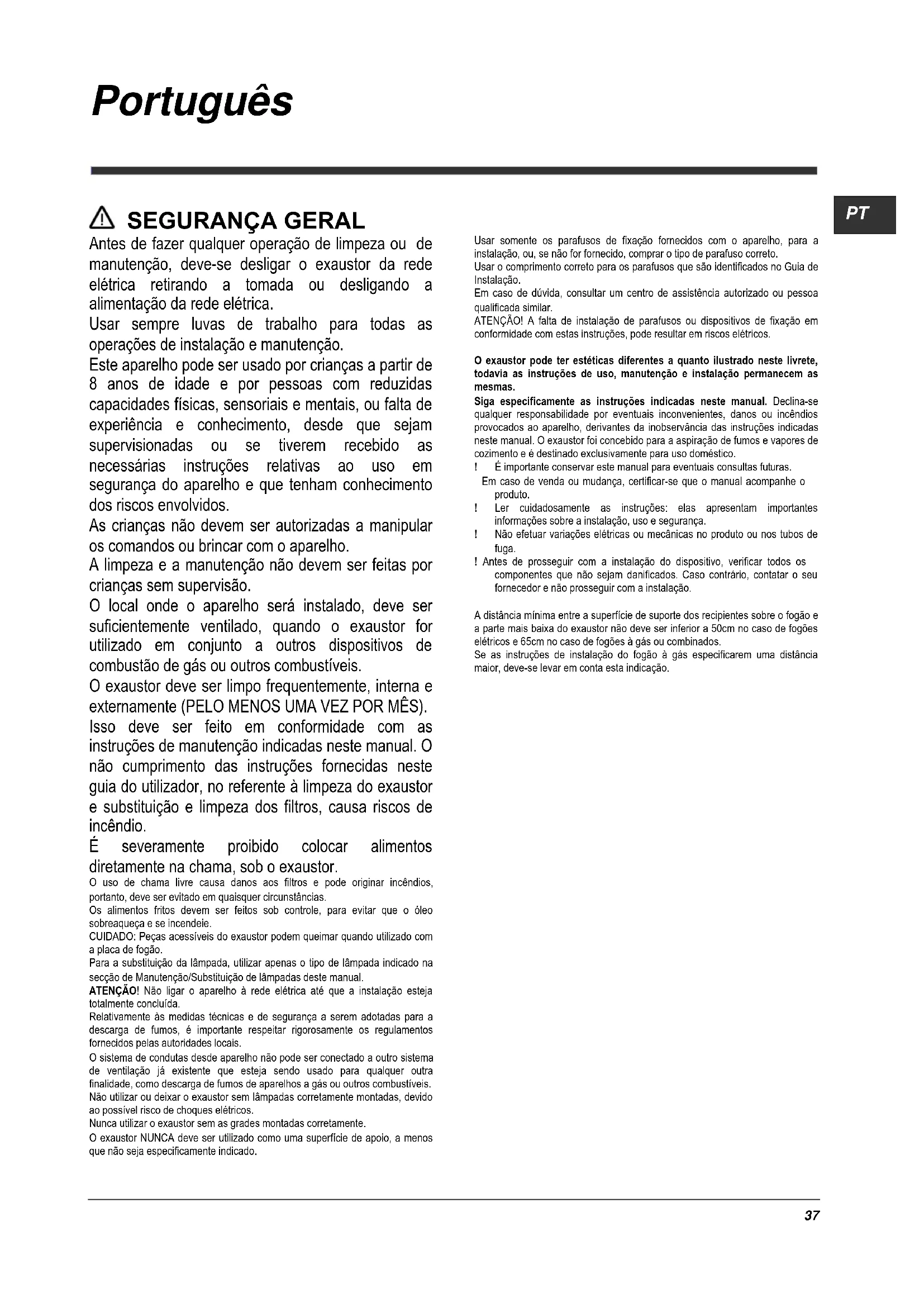 Antes de fazer qualquer operação de limpeza ou de manutenção, deve-se desligar o exaustor da rede elétrica retirando a tomada ou desligando a alimentação da rede elétrica. Usar sempre luvas de trabalho para todas as operações de instalação e manutenção. Este aparelho pode ser usado por crianças a partir de 8 anos de idade e por pessoas com reduzidas capacidades físicas, sensoriais e mentais, ou falta de experiência e conhecimento, desde que sejam supervisionadas ou se tiverem recebido as necessárias instruções relativas ao uso em segurança do aparelho e que tenham conhecimento dos riscos envolvidos. As crianças não devem ser autorizadas a manipular os comandos ou brincar com o aparelho. A limpeza e a manutenção não devem ser feitas por crianças sem supervisão. O local onde o aparelho será instalado, deve ser suficientemente ventilado, quando o exaustor for utilizado em conjunto a outros dispositivos de combustão de gás ou outros combustíveis. O exaustor deve ser limpo frequentemente, interna e externamente (PELO MENOS UMA VEZ POR MÊS). Isso deve ser feito em conformidade com as instruções de manutenção indicadas neste manual. O não cumprimento das instruções fornecidas neste guia do utilizador, no referente à limpeza do exaustor e substituição e limpeza dos filtros, causa riscos de incêndio. É severamente proibido colocar alimentos diretamente na chama, sob o exaustor. O uso de chama livre causa danos aos filtros e pode originar incêndios, portanto, deve ser evitado em quaisquer circunstâncias. Os alimentos fritos devem ser feitos sob controle, para evitar que o óleo sobreaqueça e se incendeie. CUIDADO: Peças acessíveis do exaustor podem queimar quando utilizado com a placa de fogão. Para a substituição da lâmpada, utilizar apenas o tipo de lâmpada indicado na secção de Manutenção/Substituição de lâmpadas deste manual. ATENÇÃO! Não ligar o aparelho à rede elétrica até que a instalação esteja totalmente concluída. Relativamente às medidas técnicas e de segurança a serem adotadas para a descarga de fumos, é importante respeitar rigorosamente os regulamentos fornecidos pelas autoridades locais. O sistema de condutas desde aparelho não pode ser conectado a outro sistema de ventilação já existente que esteja sendo usado para qualquer outra finalidade, como descarga de fumos de aparelhos a gás ou outros combustíveis. Não utilizar ou deixar o exaustor sem lâmpadas corretamente montadas, devido ao possível risco de choques elétricos. Nunca utilizar o exaustor sem as grades montadas corretamente. O exaustor NUNCA deve ser utilizado como uma superfície de apoio, a menos que não seja especificamente indicado. Usar somente os parafusos de fixação fornecidos com o aparelho, para a instalação, ou, se não for fornecido, comprar o tipo de parafuso correto. Usar o comprimento correto para os parafusos que são identificados no Guia de Instalação. Em caso de dúvida, consultar um centro de assistência autorizado ou pessoa qualificada similar. ATENÇÃO! A falta de instalação de parafusos ou dispositivos de fixação em conformidade com estas instruções, pode resultar em riscos elétricos. O exaustor pode ter estéticas diferentes a quanto ilustrado neste livrete, todavia as instruções de uso, manutenção e instalação permanecem as mesmas. Siga especificamente as instruções indicadas neste manual. Declina-se qualquer responsabilidade por eventuais inconvenientes, danos ou incêndios provocados ao aparelho, derivantes da inobservância das instruções indicadas neste manual. O exaustor foi concebido para a aspiração de fumos e vapores de cozimento e é destinado exclusivamente para uso doméstico. ! É importante conservar este manual para eventuais consultas futuras. Em caso de venda ou mudança, certificar-se que o manual acompanhe o produto. ! Ler cuidadosamente as instruções: elas apresentam importantes informações sobre a instalação, uso e segurança. ! Não efetuar variações elétricas ou mecânicas no produto ou nos tubos de fuga. ! Antes de prosseguir com a instalação do dispositivo, verificar todos os componentes que não sejam danificados. Caso contrário, contatar o seu fornecedor e não prosseguir com a instalação. A distância mínima entre a superfície de suporte dos recipientes sobre o fogão e a parte mais baixa do exaustor não deve ser inferior a 50cm no caso de fogões elétricos e 65cm no caso de fogões à gás ou combinados. Se as instruções de instalação do fogão à gás especificarem uma distância maior, deve-se levar em conta esta indicação.38