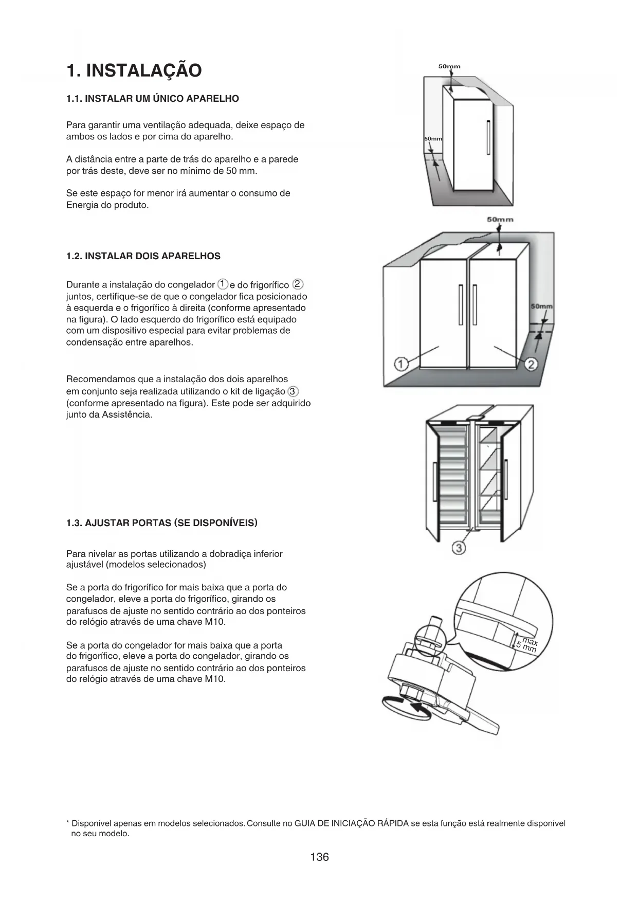 (conformeapresentadonafigura).Estepodeseradquirido juntodaAssistência. 1.3. AJUSTAR PORTAS (SE DISPONÍVEIS) Para nivelar as portas utilizando a dobradiça inferior ajustável(modelosselecionados) Seaportadofrigoríficoformaisbaixaqueaportado congelador,eleveaportadofrigorífico,girandoos parafusos de ajuste no sentido contrário ao dos ponteiros dorelógioatravésdeumachaveM10. Se a porta do congelador for mais baixa que a porta dofrigorífico,eleveaportadocongelador,girandoos parafusos de ajuste no sentido contrário ao dos ponteiros dorelógioatravésdeumachaveM10. *Disponívelapenasemmodelosselecionados.ConsultenoGUIADEINICIAÇÃORÁPIDAseestafunçãoestárealmentedisponível noseumodelo. 50mm 50mm 5 mm max137