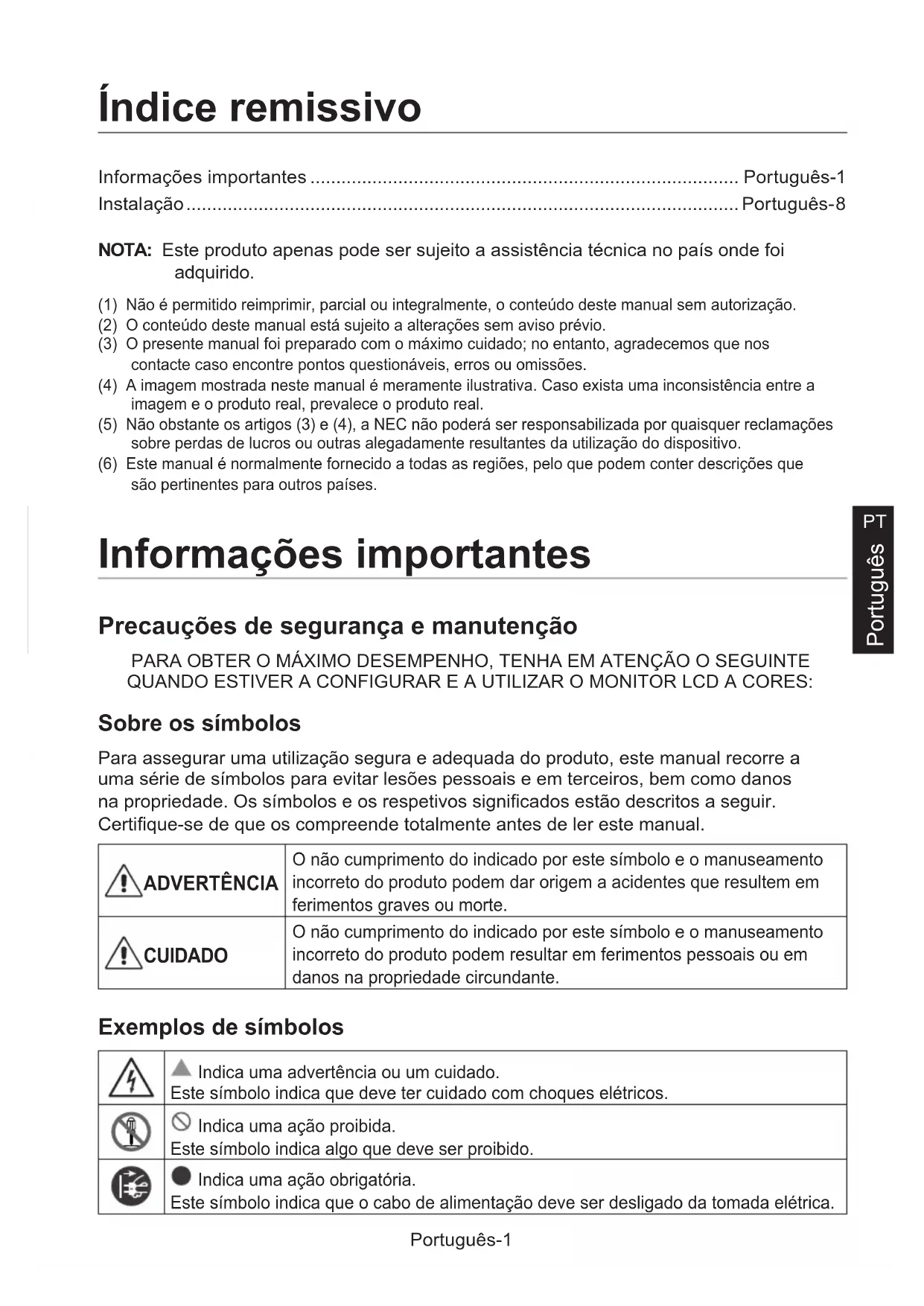 | CUIDADO | O não cumprimento do indentado por este símbolo e o manuseamento incorreto do produits poder resultar em ferimentos pessoais ou em danos na propriedade circundente. |