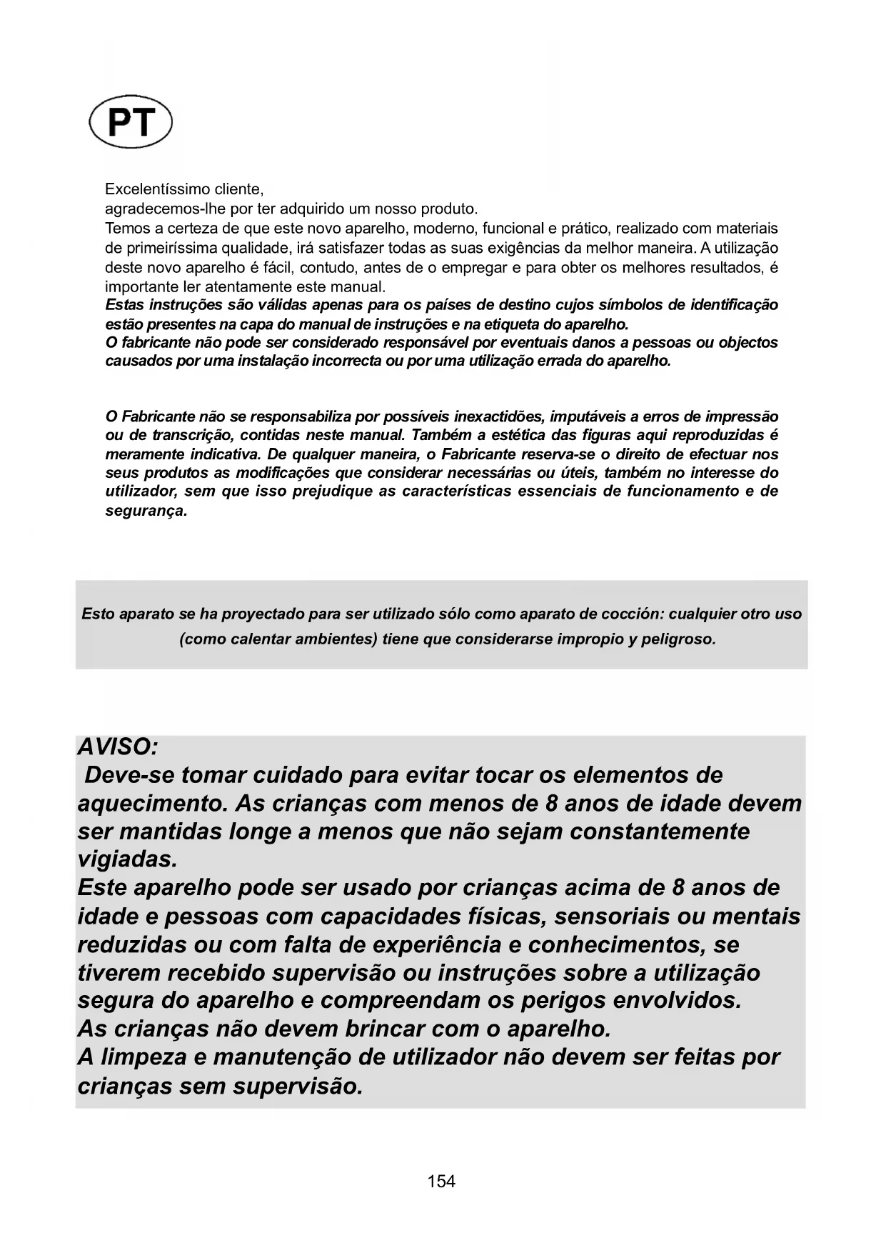 AVISO: Deve-se tomar cuidado para evitar tocar os elementos de aquecimento. As crianças com menos de 8 anos de idade devem ser mantidas longe a menos que não sejam constantemente vigiadas. Este aparelho pode ser usado por crianças acima de 8 anos de idade e pessoas com capacidades físicas, sensoriais ou mentais reduzidas ou com falta de experiência e conhecimentos, se tiverem recebido supervisão ou instruções sobre a utilização segura do aparelho e compreendam os perigos envolvidos. As crianças não devem brincar com o aparelho. A limpeza e manutenção de utilizador não devem ser feitas por crianças sem supervisão. Excelentíssimo cliente, agradecemos-lhe por ter adquirido um nosso produto. Temos a certeza de que este novo aparelho, moderno, funcional e prático, realizado com materiais de primeiríssima qualidade, irá satisfazer todas as suas exigências da melhor maneira. A utilização deste novo aparelho é fácil, contudo, antes de o empregar e para obter os melhores resultados, é importante ler atentamente este manual. Estas instruções são válidas apenas para os países de destino cujos símbolos de identificação estão presentes na capa do manual de instruções e na etiqueta do aparelho. O fabricante não pode ser considerado responsável por eventuais danos a pessoas ou objectos causados por uma instalação incorrecta ou por uma utilização errada do aparelho. O Fabricante não se responsabiliza por possíveis inexactidões, imputáveis a erros de impressão ou de transcrição, contidas neste manual. Também a estética das figuras aqui reproduzidas é meramente indicativa. De qualquer maneira, o Fabricante reserva-se o direito de efectuar nos seus produtos as modificações que considerar necessárias ou úteis, também no interesse do utilizador, sem que isso prejudique as características essenciais de funcionamento e de segurança. Esto aparato se ha proyectado para ser utilizado sólo como aparato de cocción: cualquier otro uso (como calentar ambientes) tiene que considerarse impropio y peligroso.155 1 Queimador “DUAL” de 6000 W 2 Queimador Rápido de 3000 W 3 Queimador Semi-Rápido de 1750 W 4 Queimador Auxiliar de 1000 W 5 Grelha de Ferro Fundido 6 Botão do Queimador Nr. 1 7 Botão do Queimador Nr. 2 8 Botão do Queimador Nr. 3 9 Botão do Queimador Nr. 4 Atenção: este aparelho foi projectado e fabricado para uso doméstico, em ambientes e por sujeitos privados. GWS3811.0ED GKS9851.0ED GKS3820.0ED