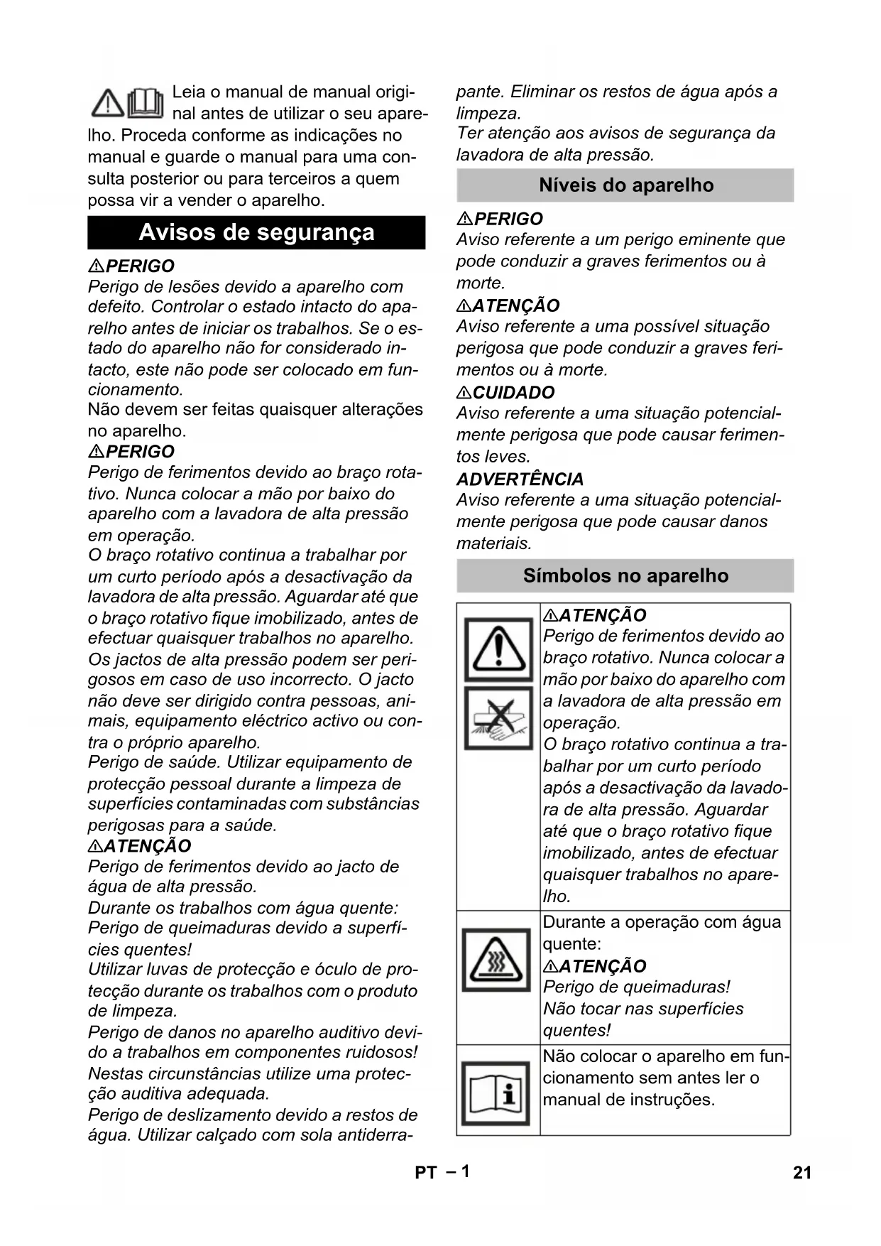 - Tras el funcionamiento con agua caliente del limpiador de superficie, operar 2 minu- tos con agua fría para que se enfríe. Si es necesario, enjuagar el limpiador de superficies y la manguera de aspira- ción con agua limpia. Proteger el aparato de las heladas. No deformar los cepillos al guardarlos. Indicación: Para asegurar un buen resultado de aspi- ración duradero, no colocar la limpiadora de superficies sobre la corona de cerdas después del uso. Enjuagar las ruedas de dirección con agua después de su uso, secarlas y pulverizarlas con aceite lubricante. El brazo de rotación no gira: Comprobar la suciedad de las boquillas de limpieza. La potencia de aspiración disminuye: Corona de cerdas desgastada - susti- tuir la corona de cerdas. Canal o tubo de aspiración atascados - limpiar el canal y el tubo de aspiración. Boquilla del inyector atascada - limpiar la boquilla del inyector. Funcionamiento Puesta fuera de servicio Cuidado del aparato Accesorios Accesorios: Nº referencia Fijación de la manguera (ventosa para fijarla a superficies lisas) 2.642-528.0 Colector de suciedad (separador de partícu- las de suciedad gruesa) 2.642-532.0 Soporte de la manguera (fijación a la pared) 2.042-001.0 Corona de cepillos FRV 50 ME 6.371-011.0 Manguera de prolonga- ción 4.441-040.0 Ayuda en caso de avería 20 ES– 1 Leia o manual de manual origi- nal antes de utilizar o seu apare- lho. Proceda conforme as indicações no manual e guarde o manual para uma con- sulta posterior ou para terceiros a quem possa vir a vender o aparelho. PERIGO Perigo de lesões devido a aparelho com defeito. Controlar o estado intacto do apa- relho antes de iniciar os trabalhos. Se o es- tado do aparelho não for considerado in- tacto, este não pode ser colocado em fun- cionamento. Não devem ser feitas quaisquer alterações no aparelho. PERIGO Perigo de ferimentos devido ao braço rota- tivo. Nunca colocar a mão por baixo do aparelho com a lavadora de alta pressão em operação. O braço rotativo continua a trabalhar por um curto período após a desactivação da lavadora de alta pressão. Aguardar até que o braço rotativo fique imobilizado, antes de efectuar quaisquer trabalhos no aparelho. Os jactos de alta pressão podem ser peri- gosos em caso de uso incorrecto. O jacto não deve ser dirigido contra pessoas, ani- mais, equipamento eléctrico activo ou con- tra o próprio aparelho. Perigo de saúde. Utilizar equipamento de protecção pessoal durante a limpeza de superfícies contaminadas com substâncias perigosas para a saúde. 몇 ATENÇÃO Perigo de ferimentos devido ao jacto de água de alta pressão. Durante os trabalhos com água quente: Perigo de queimaduras devido a superfí- cies quentes! Utilizar luvas de protecção e óculo de pro- tecção durante os trabalhos com o produto de limpeza. Perigo de danos no aparelho auditivo devi- do a trabalhos em componentes ruidosos! Nestas circunstâncias utilize uma protec- ção auditiva adequada. Perigo de deslizamento devido a restos de água. Utilizar calçado com sola antiderra- pante. Eliminar os restos de água após a limpeza. Ter atenção aos avisos de segurança da lavadora de alta pressão. PERIGO Aviso referente a um perigo eminente que pode conduzir a graves ferimentos ou à morte. 몇 ATENÇÃO Aviso referente a uma possível situação perigosa que pode conduzir a graves feri- mentos ou à morte. 몇 CUIDADO Aviso referente a uma situação potencial- mente perigosa que pode causar ferimen- tos leves. ADVERTÊNCIA Aviso referente a uma situação potencial- mente perigosa que pode causar danos materiais. Avisos de segurança Níveis do aparelho Símbolos no aparelho 몇 ATENÇÃO Perigo de ferimentos devido ao braço rotativo. Nunca colocar a mão por baixo do aparelho com a lavadora de alta pressão em operação. O braço rotativo continua a tra- balhar por um curto período após a desactivação da lavado- ra de alta pressão. Aguardar até que o braço rotativo fique imobilizado, antes de efectuar quaisquer trabalhos no apare- lho. Durante a operação com água quente: 몇 ATENÇÃO Perigo de queimaduras! Não tocar nas superfícies quentes! Não colocar o aparelho em fun- cionamento sem antes ler o manual de instruções. 21PT– 2 O produto de limpeza de superfícies é ade- quado para a limpeza de solos, em conjunto com uma lavadora de alta pressão. Pressão máxima da água 25 MPa (250 bar). Temperatura máxima da água 85 °C. A água suja é escoada por uma mangueira. Os materiais de embalagem são reci- cláveis. Não coloque as embalagens no lixo doméstico, envie-as para uma uni- dade de reciclagem. Os aparelhos velhos contêm mate- riais preciosos e recicláveis e deve- rão ser reutilizados. Por isso, elimine os aparelhos velhos através de sistemas de recolha de lixo adequados. Avisos sobre os ingredientes (REACH) Informações actuais sobre os ingredientes podem ser encontradas em: www.kaercher.com/REACH Para que seja possível um funcionamento sem avarias da sua máquina de alta pres- são, tem de utilizar os bocais de alta pres- são adequados. Aviso: Os pacotes de bocais necessários foram especialmente concebidos para os respec- tivos lavadores de pressão e devem ser en- comendados separadamente. Figura 1, ver lado desdobrável 1 Dimensão do bocal (exemplo) Consultar a dimensão do bocal na pla- ca de características da lavadora de alta pressão. Seleccionar um pacote de bocais ade- quado para a lavadora de alta pressão na tabela seguinte. Figura 2, ver lado desdobrável 1O-Ring 2 Braço rotativo 3 Bocal 4 Porca de capa Colocar o O-Ring na ranhura do braço rotativo. Colocar o bocal. Aparafusar levemente o bocal com a porca de capa. Aviso: O jacto de saída deve ser orientado parale- lamente ao braço rotativo. Figura 3, ver lado desdobrável A superfície da chave do bocal (abertu- ra da chave 10) deve ser alinhada para- lelamente ao braço rotativo. Apertar a porca de capa (abertura da chave 22) com a ch