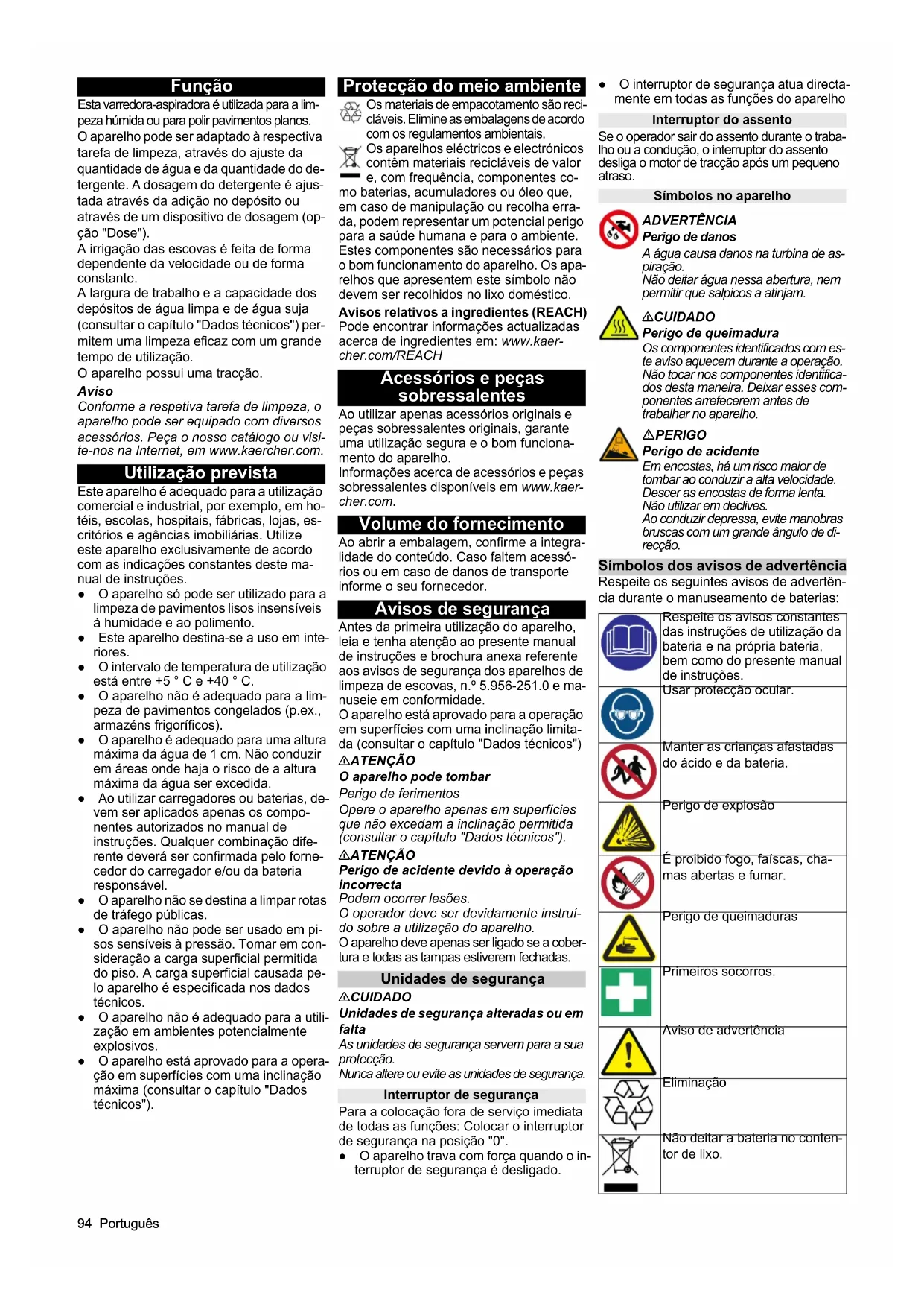 • Declaração de conformidade UE 4 Português Função Esta varredora-aspiradora é utilizada para a lim- peza húmida ou para polir pavimentos planos. O aparelho pode ser adaptado à respectiva tarefa de limpeza, através do ajuste da quantidade de água e da quantidade do de- tergente. A dosagem do detergente é ajus- tada através da adição no depósito ou através de um dispositivo de dosagem (op- ção "Dose"). A irrigação das escovas é feita de forma dependente da velocidade ou de forma constante. A largura de trabalho e a capacidade dos depósitos de água limpa e de água suja (consultar o capítulo "Dados técnicos") per- mitem uma limpeza eficaz com um grande tempo de utilização. O aparelho possui uma tracção. Aviso Conforme a respetiva tarefa de limpeza, o aparelho pode ser equipado com diversos acessórios. Peça o nosso catálogo ou visi- te-nos na Internet, em www.kaercher.com. Utilização prevista Este aparelho é adequado para a utilização comercial e industrial, por exemplo, em ho- téis, escolas, hospitais, fábricas, lojas, es- critórios e agências imobiliárias. Utilize este aparelho exclusivamente de acordo com as indicações constantes deste ma- nual de instruções. ● O aparelho só pode ser utilizado para a limpeza de pavimentos lisos insensíveis à humidade e ao polimento. ● Este aparelho destina-se a uso em inte- riores. ● O intervalo de temperatura de utilização está entre +5 ° C e +40 ° C. ● O aparelho não é adequado para a lim- peza de pavimentos congelados (p.ex., armazéns frigoríficos). ● O aparelho é adequado para uma altura máxima da água de 1 cm. Não conduzir em áreas onde haja o risco de a altura máxima da água ser excedida. ● Ao utilizar carregadores ou baterias, de- vem ser aplicados apenas os compo- nentes autorizados no manual de instruções. Qualquer combinação dife- rente deverá ser confirmada pelo forne- cedor do carregador e/ou da bateria responsável. ● O aparelho não se destina a limpar rotas de tráfego públicas. ● O aparelho não pode ser usado em pi- sos sensíveis à pressão. Tomar em con- sideração a carga superficial permitida do piso. A carga superficial causada pe- lo aparelho é especificada nos dados técnicos. ● O aparelho não é adequado para a utili- zação em ambientes potencialmente explosivos. ● O aparelho está aprovado para a opera- ção em superfícies com uma inclinação máxima (consultar o capítulo "Dados técnicos"). Protecção do meio ambiente Os materiais de empacotamento são reci- cláveis. Elimine as embalagens de acordo com os regulamentos ambientais. Os aparelhos eléctricos e electrónicos contêm materiais recicláveis de valor e, com frequência, componentes co- mo baterias, acumuladores ou óleo que, em caso de manipulação ou recolha erra- da, podem representar um potencial perigo para a saúde humana e para o ambiente. Estes componentes são necessários para o bom funcionamento do aparelho. Os apa- relhos que apresentem este símbolo não devem ser recolhidos no lixo doméstico. Avisos relativos a ingredientes (REACH) Pode encontrar informações actualizadas acerca de ingredientes em: www.kaer- cher.com/REACH Acessórios e peças sobressalentes Ao utilizar apenas acessórios originais e peças sobressalentes originais, garante uma utilização segura e o bom funciona- mento do aparelho. Informações acerca de acessórios e peças sobressalentes disponíveis em www.kaer- cher.com. Volume do fornecimento Ao abrir a embalagem, confirme a integra- lidade do conteúdo. Caso faltem acessó- rios ou em caso de danos de transporte informe o seu fornecedor. Avisos de segurança Antes da primeira utilização do aparelho, leia e tenha atenção ao presente manual de instruções e brochura anexa referente aos avisos de segurança dos aparelhos de limpeza de escovas, n.º 5.956-251.0 e ma- nuseie em conformidade. O aparelho está aprovado para a operação em superfícies com uma inclinação limita- da (consultar o capítulo "Dados técnicos") 몇 ATENÇÃO O aparelho pode tombar Perigo de ferimentos Opere o aparelho apenas em superfícies que não excedam a inclinação permitida (consultar o capítulo "Dados técnicos"). 몇 ATENÇÃO Perigo de acidente devido à operação incorrecta Podem ocorrer lesões. O operador deve ser devidamente instruí- do sobre a utilização do aparelho. O aparelho deve apenas ser ligado se a cober- tura e todas as tampas estiverem fechadas. Unidades de segurança 몇 CUIDADO Unidades de segurança alteradas ou em falta As unidades de segurança servem para a sua protecção. Nunca altere ou evite as unidades de segurança. Interruptor de segurança Para a colocação fora de serviço imediata de todas as funções: Colocar o interruptor de segurança na posição "0". ● O aparelho trava com força quando o in- terruptor de segurança é desligado. ● O interruptor de segurança atua directa- mente em todas as funções do aparelho Interruptor do assento Se o operador sair do assento durante o traba- lho ou a condução, o interruptor do assento desliga o motor de tracção após um pequeno atraso. Símbolos no aparelho ADVERTÊNCIA Perigo de danos A água causa danos na turbina de as- piração. Não deitar água nessa abertura, nem permitir que salpicos a atinjam. 몇CUIDADO Perigo de queimadura Os componentes identificados com es- te aviso aquecem durante a operação. Não tocar nos componentes identifica- dos desta maneira. Deixar esses com- ponentes arrefecerem antes de trabalhar no aparelho. PERIGO Perigo de acidente Em encostas, há um risco maior de tombar ao conduzir a alta velocidade. Descer as encostas de forma lenta. Não utilizar em declives. Ao conduzir depressa, evite manobras bruscas com um grande ângulo de di- recção. Símbolos dos avisos de advertência Respeite os seguintes avisos de advertên- cia durante o manuseamento de baterias: Respeite os avisos constantes das instruções de util