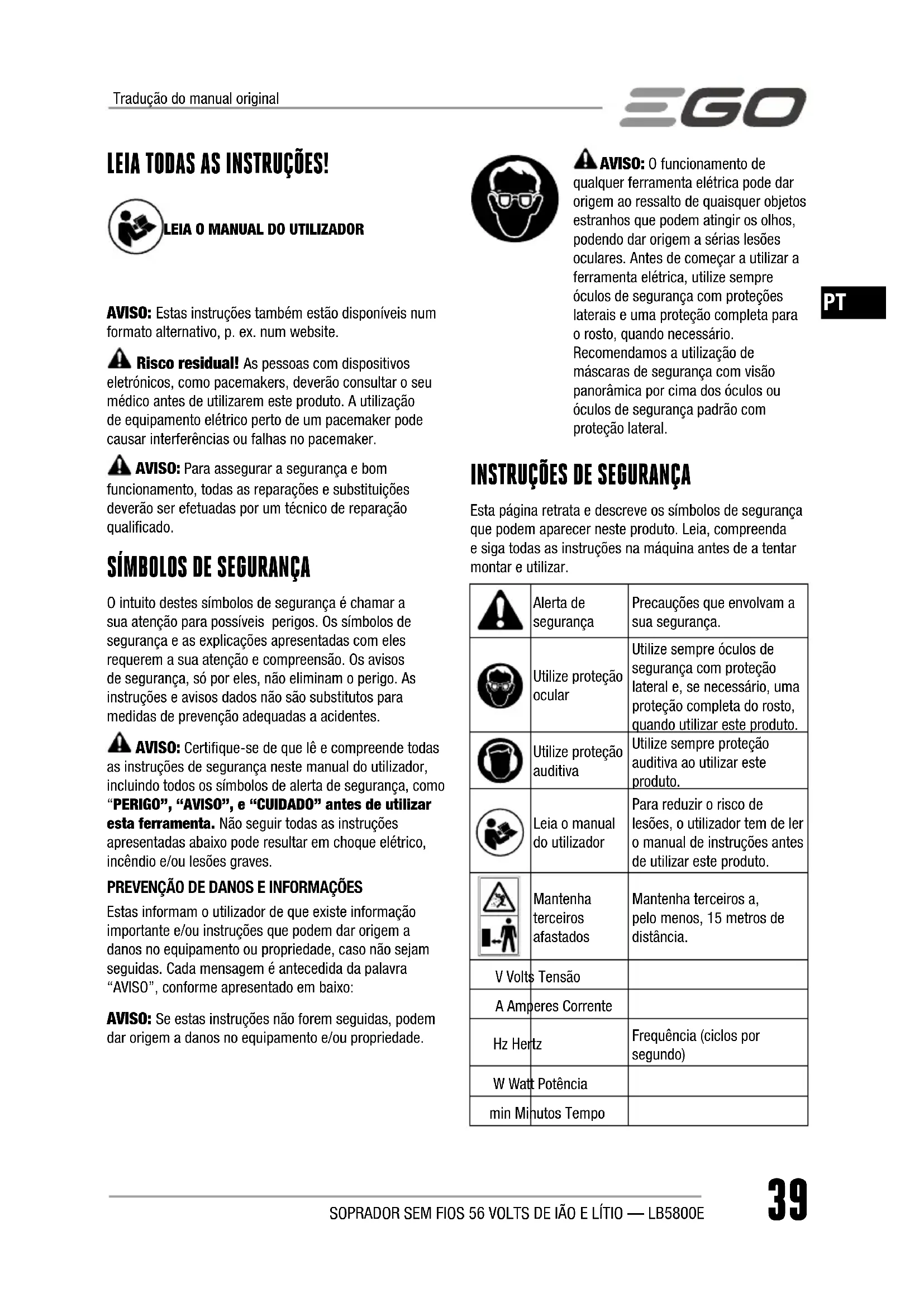 Esta página retrata e descreve os símbolos de segurança que podem aparecer neste produto. Leia, compreenda e siga todas as instruções na máquina antes de a tentar montar e utilizar.Alerta de segurançaPrecauções que envolvam a sua segurança.Utilize proteção ocularUtilize sempre óculos de segurança com proteção lateral e, se necessário, uma proteção completa do rosto, quando utilizar este produto.Utilize proteção auditivaUtilize sempre proteção auditiva ao utilizar este produto. Leia o manual do utilizadorPara reduzir o risco de lesões, o utilizador tem de ler o manual de instruções antes de utilizar este produto.Mantenha terceiros afastadosMantenha terceiros a, pelo menos, 15 metros de distância.V Volts TensãoA Amperes CorrenteHz HertzFrequência (ciclos por segundo)W Watt Potênciamin Minutos TempoTradução do manual originalSOPRADOR SEM FIOS 56 VOLTS DE IÃO E LÍTIO — LB5800E40