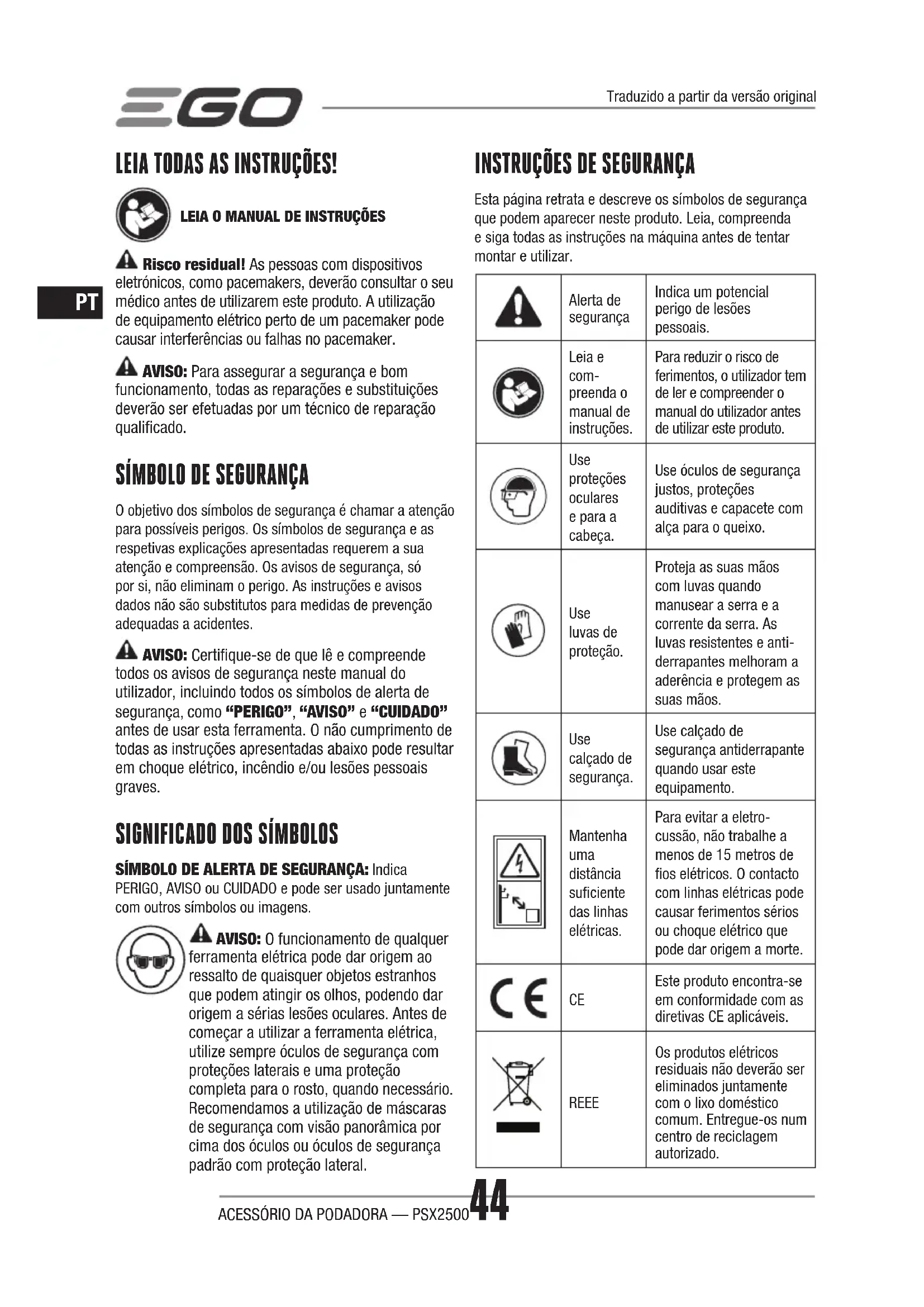 ◾ Não carregue a bateria à chuva ou em condições húmidas. ◾ A bateria tem de ser retirada do aparelho antes de ser eliminada. ◾ A bateria tem de ser eliminada de modo seguro. ◾ Não atire a bateria para o fogo. As células podem explodir. Verifique as normas locais quanto a possíveis instruções especiais de eliminação. ◾ Não abra nem altere a bateria. O eletrólito libertado é corrosivo e pode causar lesões nos olhos ou pele. Pode ser tóxico se engolido. CUIDADO! O eletrólito é um ácido sulfúrico diluído nocivo para a pele e olhos. É um condutor eletrónico e é corrosivo. ◾ Tenha muito cuidado ao manusear as baterias, de modo a não as colocar em curto-circuito com materiais condutores, como anéis, pulseiras e chaves. A bateria ou o condutor podem sobreaquecer e causar queimaduras. ◾ As ferramentas que funcionam a bateria não têm de ser ligadas a uma tomada. Assim, estão sempre em estado de funcionamento. Tenha cuidado com possíveis perigos quando o aparelho não estiver a funcionar. Tenha cuidado quando efetuar a manutenção ou reparações. ◾ Retire ou desligue a bateria antes de reparar, limpar ou retirar material da ferramenta. ◾ Peças de substituição - Quando fizer reparações, utilize apenas peças sobresselentes idênticas da EGO. A utilização de outros acessórios pode aumentar o risco de lesões. ◾ Não lave com uma mangueira. Evite que entre água no motor e nas ligações elétricas. ◾ Se ocorrerem situações que não sejam abrangidas por este manual, tenha cuidado e faça uso do bom senso. Contacte o centro de reparação da EGO para obter assistência. ◾ Guarde estas instruções. Consulte com frequência e utilize estas instruções para instruir outras pessoas sobre a forma de utilizar esta ferramenta. ◾ Se emprestar este aparelho, entregue também estas instruções, para evitar uma má utilização do produto e possíveis lesões. ◾ Utilize apenas com as baterias e carregadores listados na Imagem A2.ACESSÓRIO DA PODADORA — PSX2500