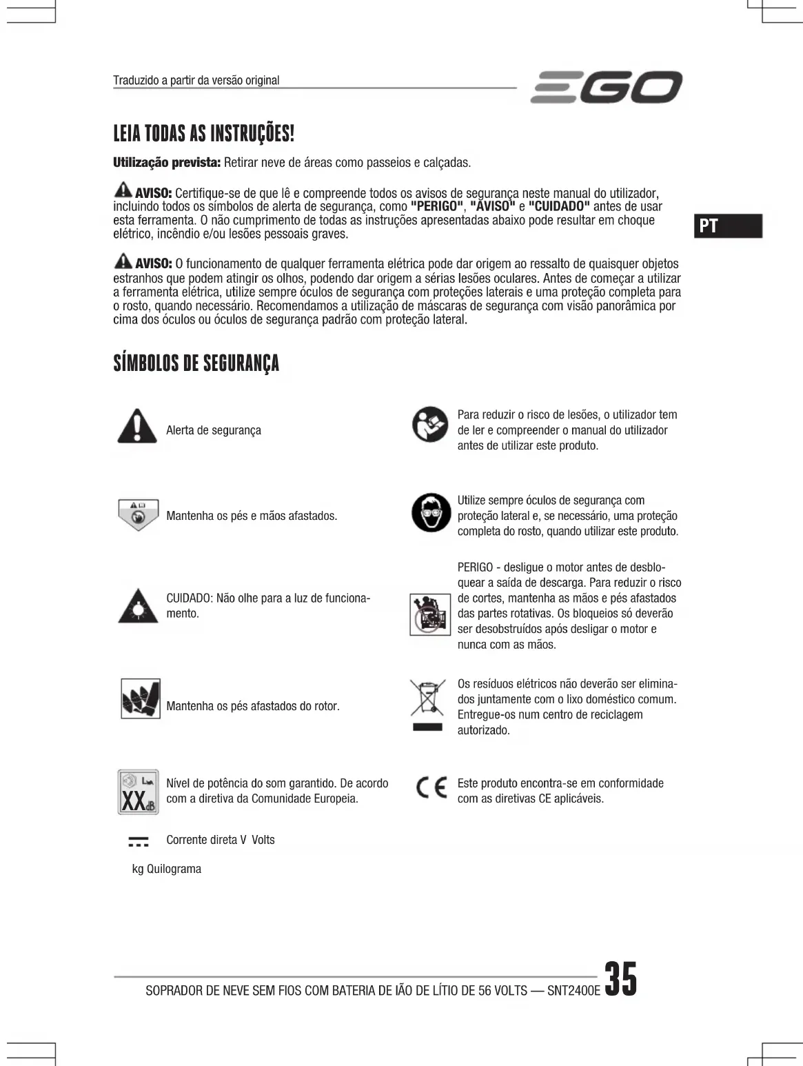 Nível de potência do som garantido. De acordo com a diretiva da Comunidade Europeia.Este produto encontra-se em conformidade com as diretivas CE aplicáveis.Corrente direta V Voltskg QuilogramaTraduzido a partir da versão originalSOPRADOR DE NEVE SEM FIOS COM BATERIA DE IÃO DE LÍTIO DE 56 VOLTS — SNT2400E36