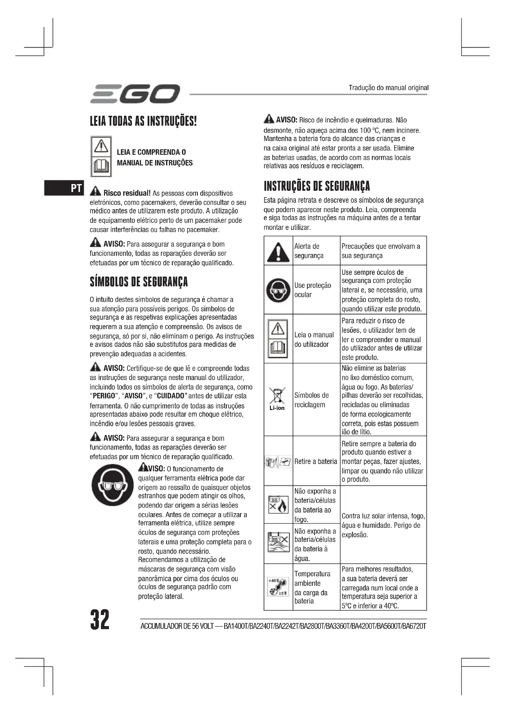 O intuito destes símbolos de segurança é chamar a sua atenção para possíveis perigos. Os símbolos de segurança e as respetivas explicações apresentadas requerem a sua atenção e compreensão. Os avisos de segurança, só por si, não eliminam o perigo. As instruções e avisos dados não são substitutos para medidas de prevenção adequadas a acidentes. AVISO: Certifique-se de que lê e compreende todas as instruções de segurança neste manual do utilizador, incluindo todos os símbolos de alerta de segurança, como “PERIGO”, “AVISO”, e “CUIDADO” antes de utilizar esta ferramenta. O não cumprimento de todas as instruções apresentadas abaixo pode resultar em choque elétrico, incêndio e/ou lesões pessoais graves. AVISO: Para assegurar a segurança e bom funcionamento, todas as reparações deverão ser efetuadas por um técnico de reparação qualificado. AVISO: O funcionamento de qualquer ferramenta elétrica pode dar origem ao ressalto de quaisquer objetos estranhos que podem atingir os olhos, podendo dar origem a sérias lesões oculares. Antes de começar a utilizar a ferramenta elétrica, utilize sempre óculos de segurança com proteções laterais e uma proteção completa para o rosto, quando necessário. Recomendamos a utilização de máscaras de segurança com visão panorâmica por cima dos óculos ou óculos de segurança padrão com proteção lateral. AVISO: Risco de incêndio e queimaduras. Não desmonte, não aqueça acima dos 100 ºC, nem incinere. Mantenha a bateria fora do alcance das crianças e na caixa original até estar pronta a ser usada. Elimine as baterias usadas, de acordo com as normas locais relativas aos resíduos e reciclagem.