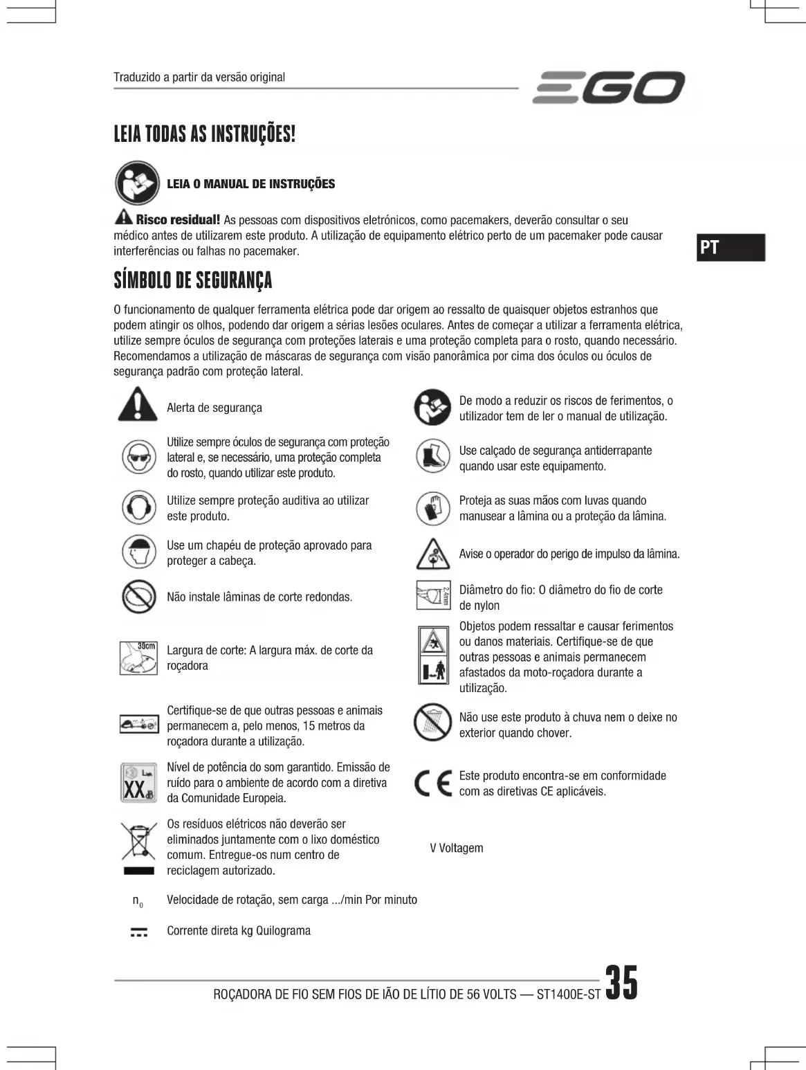 O funcionamento de qualquer ferramenta elétrica pode dar origem ao ressalto de quaisquer objetos estranhos que podem atingir os olhos, podendo dar origem a sérias lesões oculares. Antes de começar a utilizar a ferramenta elétrica, utilize sempre óculos de segurança com proteções laterais e uma proteção completa para o rosto, quando necessário. Recomendamos a utilização de máscaras de segurança com visão panorâmica por cima dos óculos ou óculos de segurança padrão com proteção lateral. Alerta de segurançaDe modo a reduzir os riscos de ferimentos, o utilizador tem de ler o manual de utilização.Utilize sempre óculos de segurança com proteção lateral e, se necessário, uma proteção completa do rosto, quando utilizar este produto.Use calçado de segurança antiderrapante quando usar este equipamento.Utilize sempre proteção auditiva ao utilizar este produto.Proteja as suas mãos com luvas quando manusear a lâmina ou a proteção da lâmina.Use um chapéu de proteção aprovado para proteger a cabeça.Avise o operador do perigo de impulso da lâmina.Não instale lâminas de corte redondas. 2.4mmDiâmetro do fio: O diâmetro do fio de corte de nylon 38cm 35cm Largura de corte: A largura máx. de corte da roçadoraObjetos podem ressaltar e causar ferimentos ou danos materiais. Certifique-se de que outras pessoas e animais permanecem afastados da moto-roçadora durante a utilização. 15m Certifique-se de que outras pessoas e animais permanecem a, pelo menos, 15 metros da roçadora durante a utilização.Não use este produto à chuva nem o deixe no exterior quando chover.