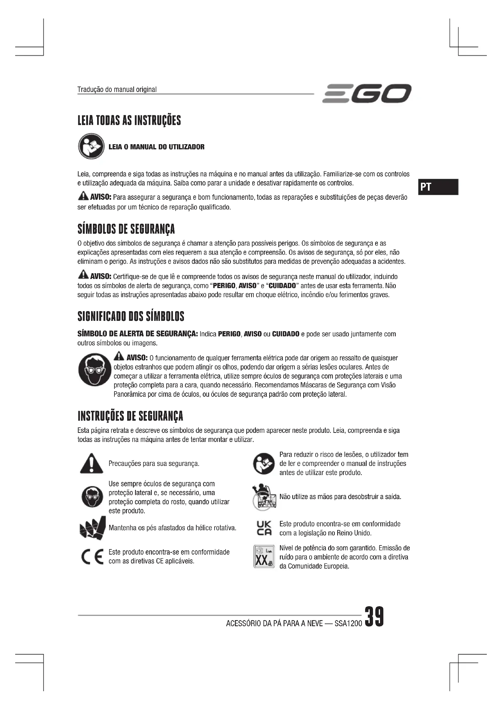Esta página retrata e descreve os símbolos de segurança que podem aparecer neste produto. Leia, compreenda e siga todas as instruções na máquina antes de tentar montar e utilizar.Precauções para sua segurança.Para reduzir o risco de lesões, o utilizador tem de ler e compreender o manual de instruções antes de utilizar este produto.Use sempre óculos de segurança com proteção lateral e, se necessário, uma proteção completa do rosto, quando utilizar este produto.Não utilize as mãos para desobstruir a saída.Mantenha os pés afastados da hélice rotativa.Este produto encontra-se em conformidade com a legislação no Reino Unido.Este produto encontra-se em conformidade com as diretivas CE aplicáveis.